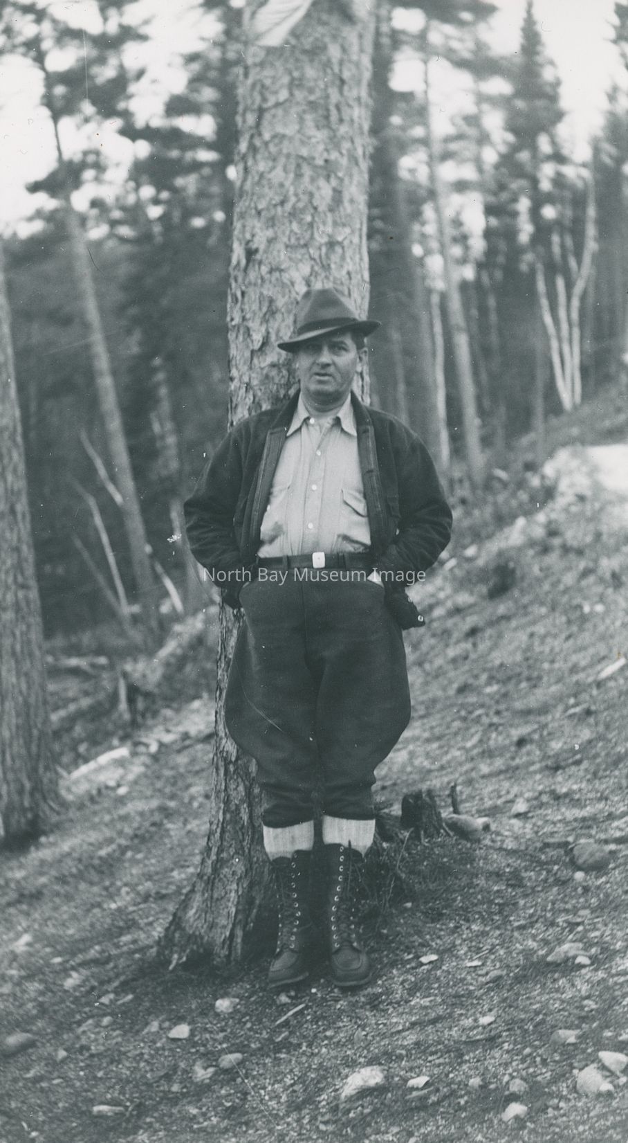 Print, Photographic - black and white photograph - picture of man posing in front of large tree - he is wearing work clothes and tall lace-up boots
