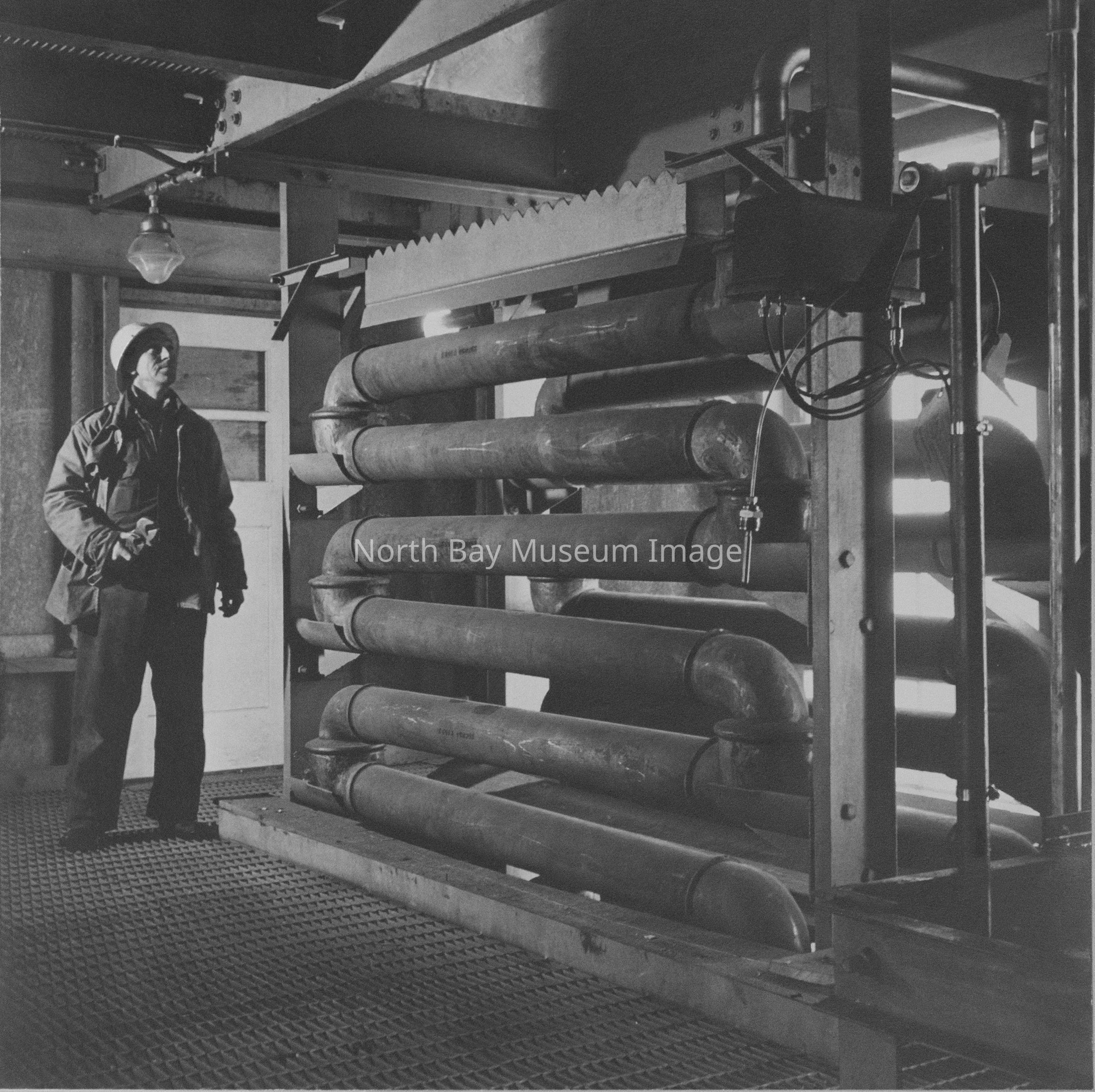 Print is a black and white photograph showing a worker, wrench in his right hand, standing on a grid floor and observing a series of horizontal pipes in an industrial setting. Possible locations include the Dupont Plant or the reconditioned water plant on Memorial Drive.