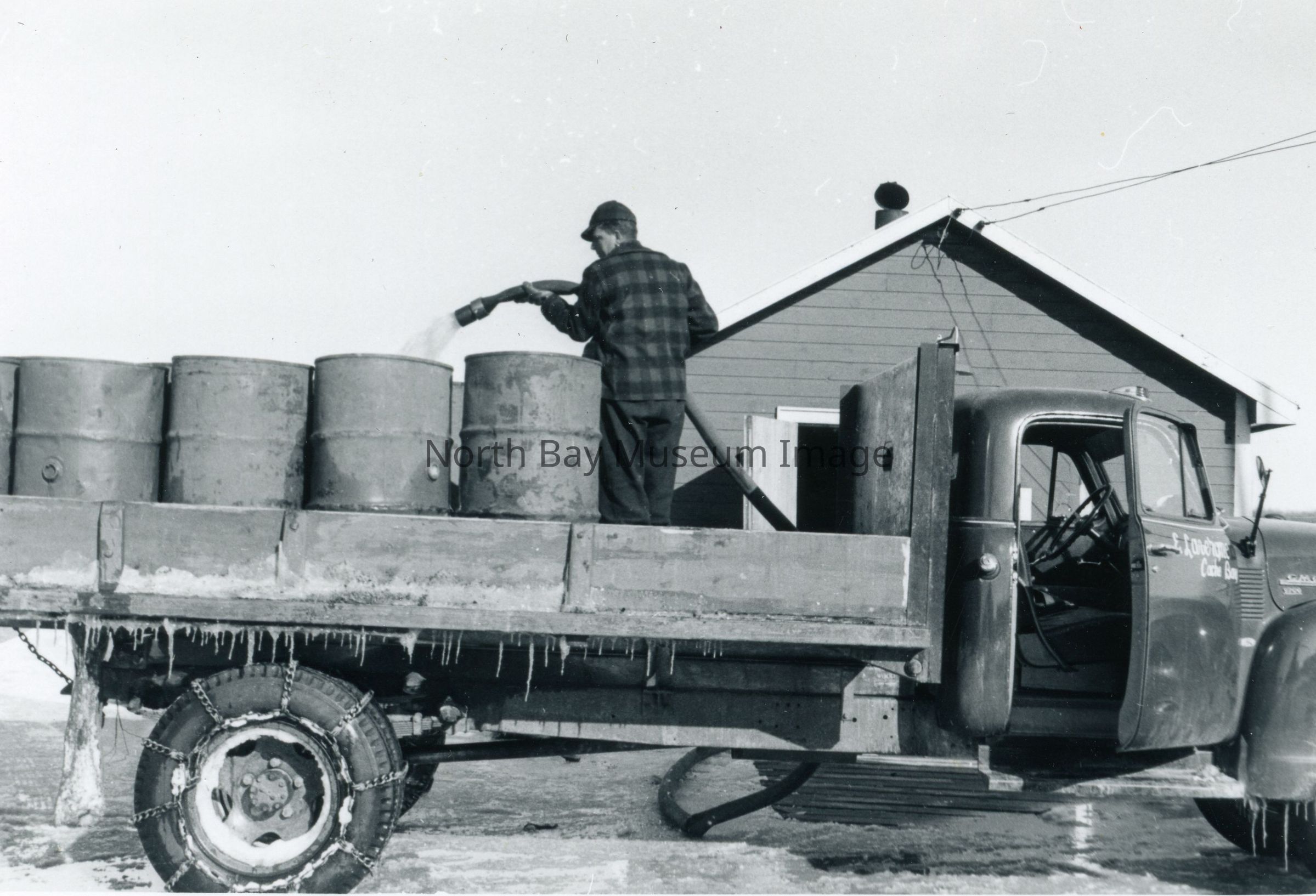 -Picture of a man standing on the back of a truck filling metal banks