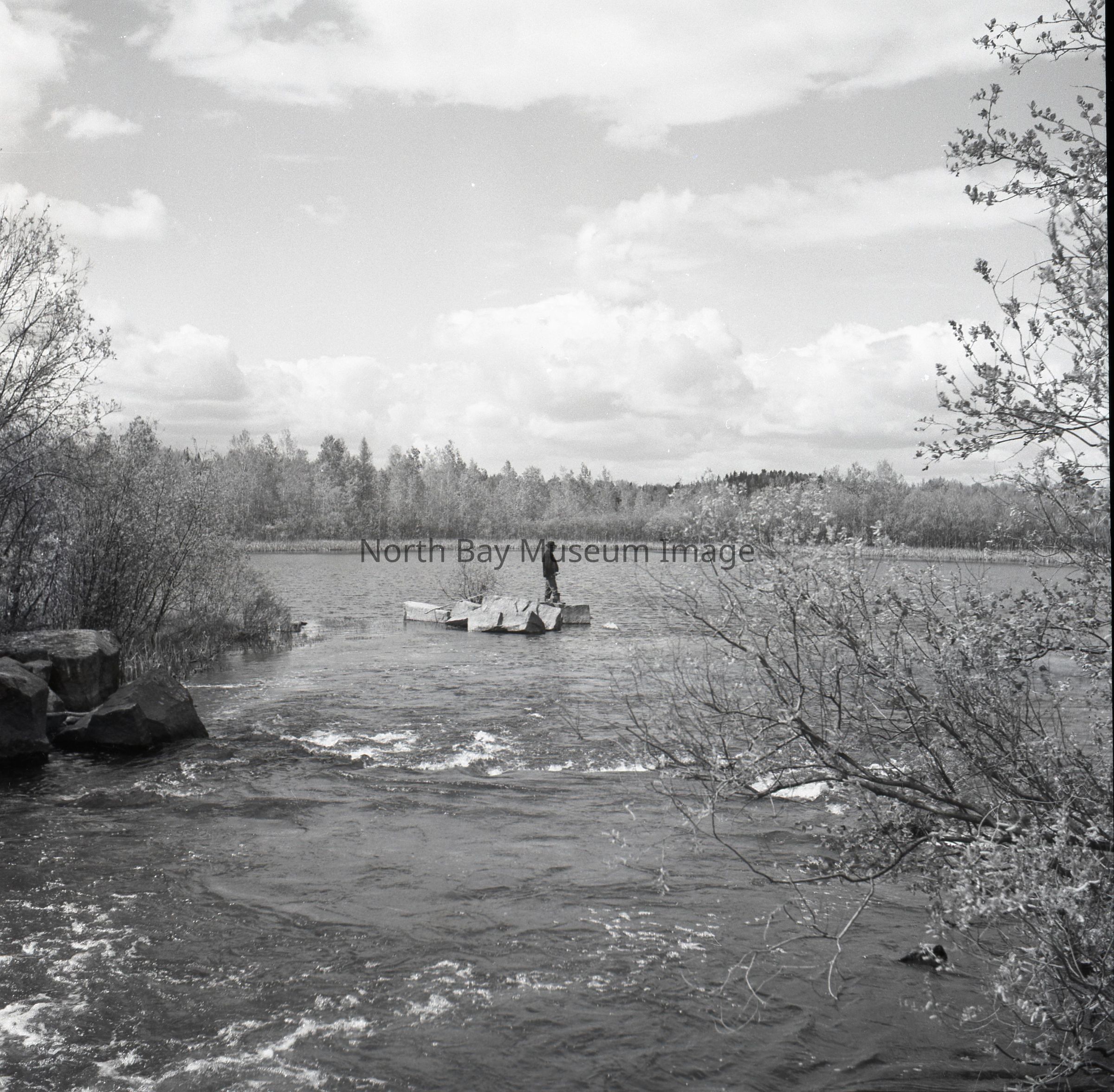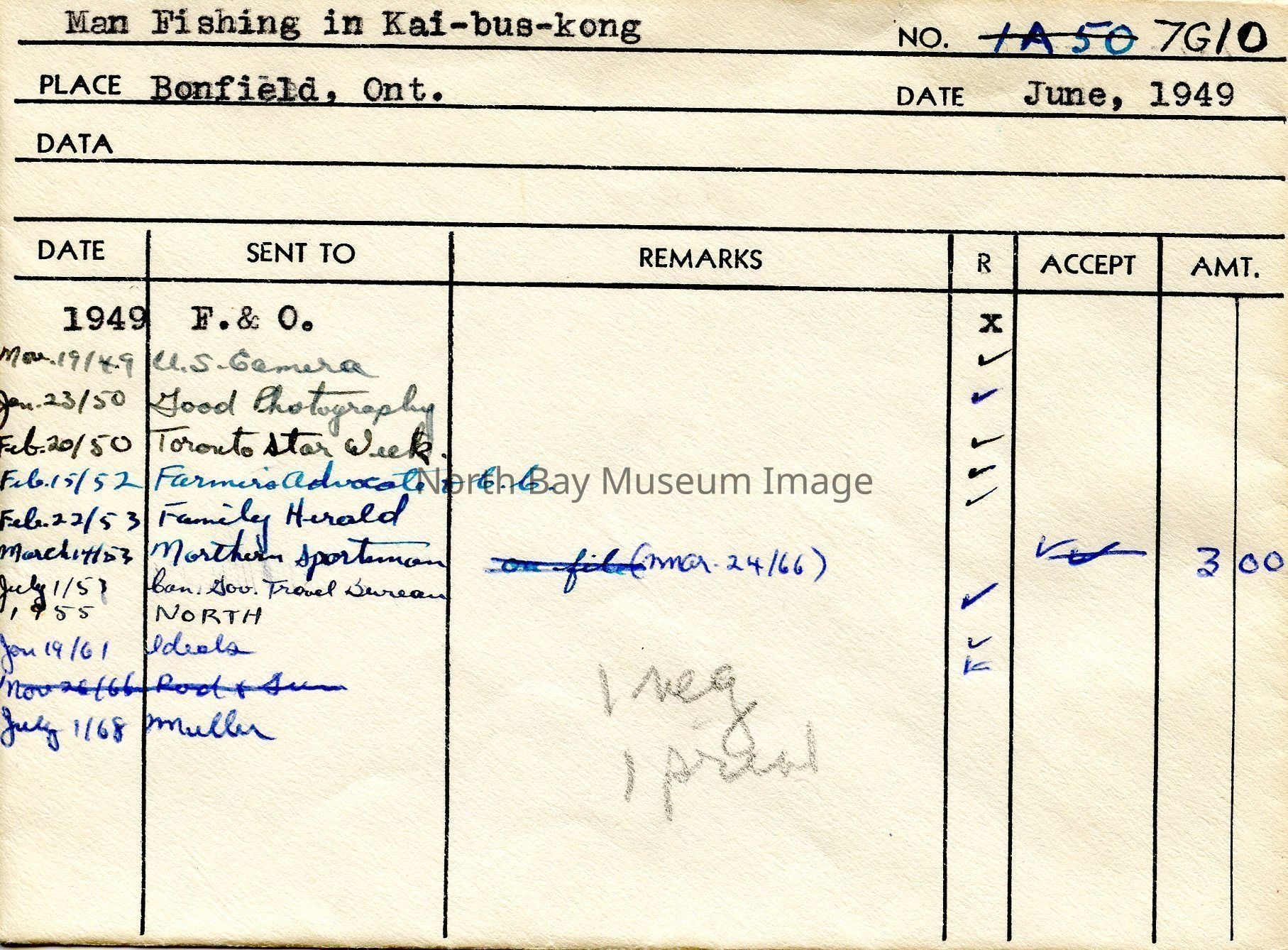 Envelope (a) containing negative (b) and photograph (c) of a man fishing in Kai-bus-kong in Bonfield, ON. The image shows a man in the distance standing and fishing on top of what appears to be concrete of some type. He is dressed in dark colours and a dark, black hat. The nature scene around hims depicts a clear blue sky with a few clouds and lots of vegetation. A part of the Forder Collection. The photographers original number was 7g10. All of the publications of the photo are listed on the envelope.Creator