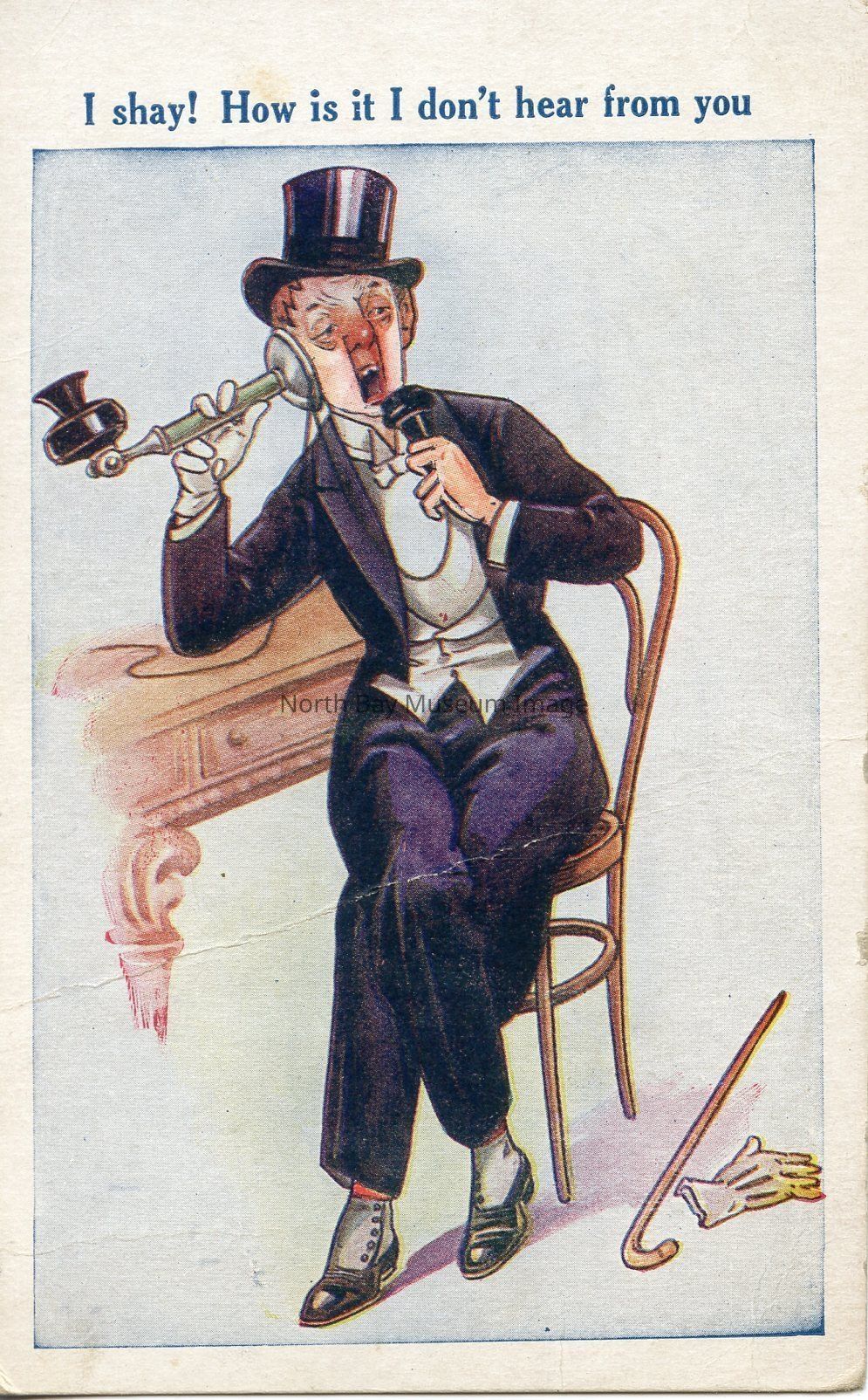 This is a vertical, coloured postcard. The front of the postcard has an illustration of a man sitting at a desk on the telephone. The man is wearing a tuxedo. The man appears to yawning or talking on the telephone The caption is "I shay! How is it I don't hear from you."