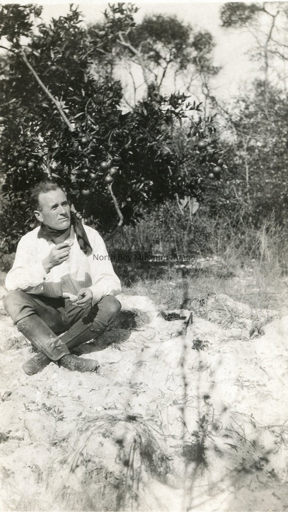 Black and white postcard of Joe Sheedy enjoying a "shore lunch". Back of post card separatedinto sections for Correspondence, Address and Place Stamp Here