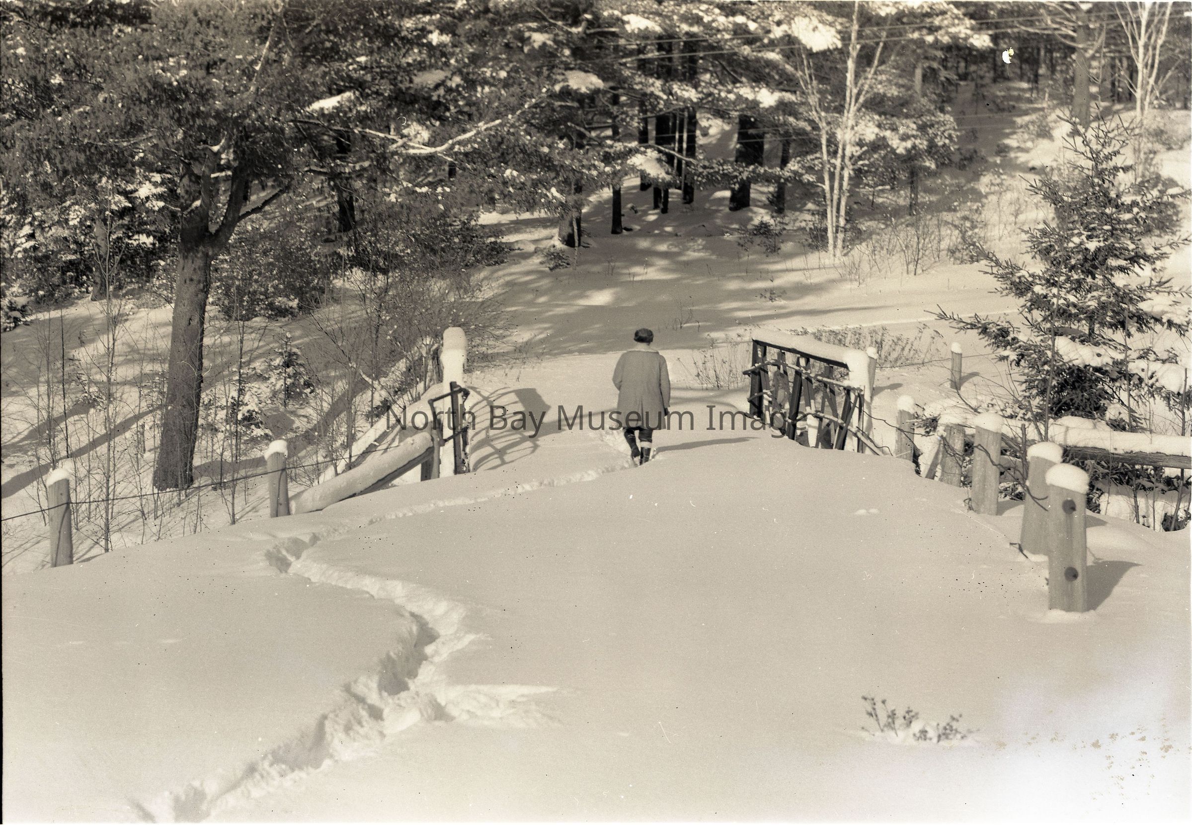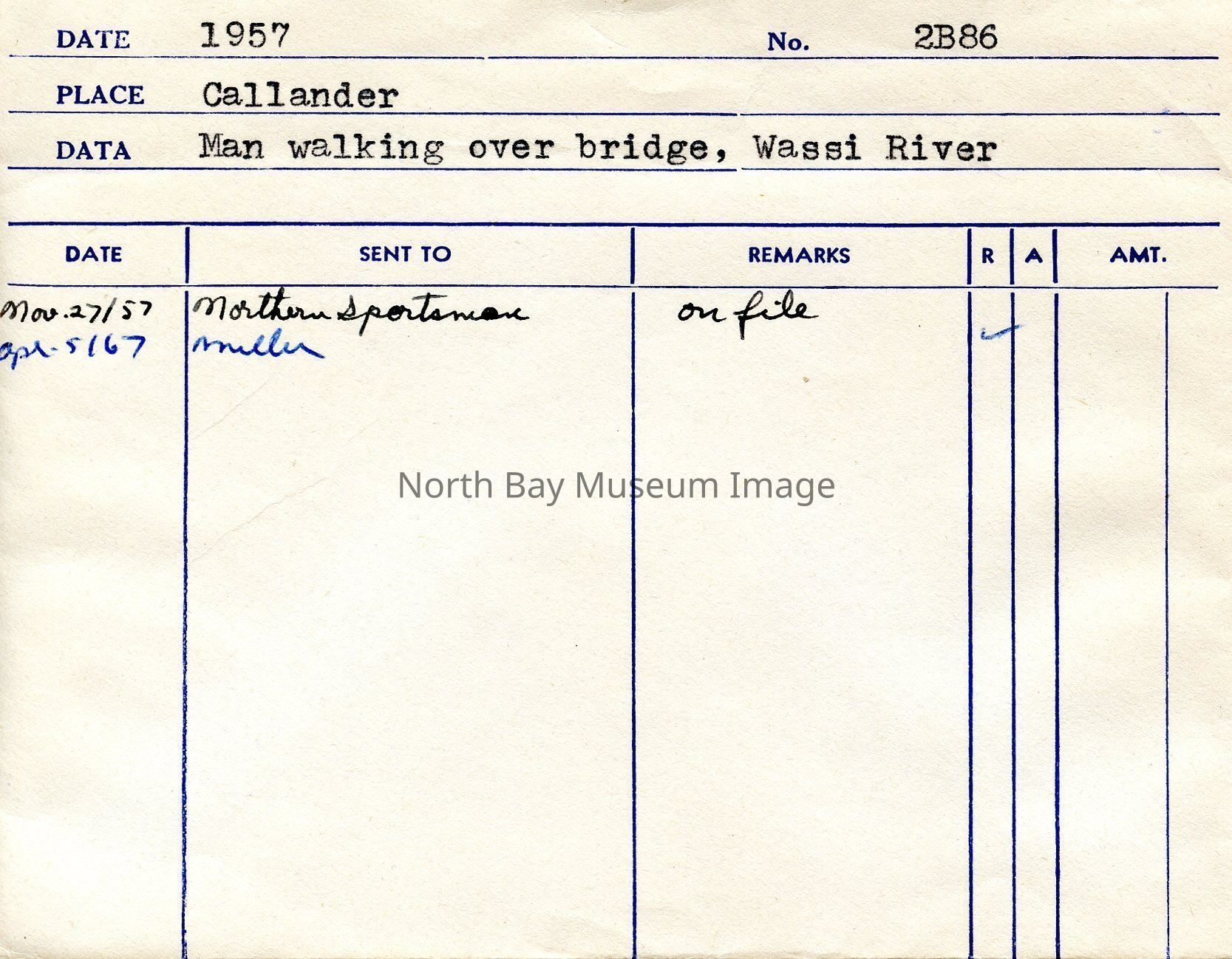Envelope (a) containing photographs and negative (b-d) of a man walking over a bridge near the wassi (wasi) river. The negative and photograph capture images of a man in the winter time crossing a bridge. There are trees in the background and lots of snow on the ground. A part of the Forder Collection. The photographers original number is 2B86. All of the photographs publications are listed on the the envelope.Creator
