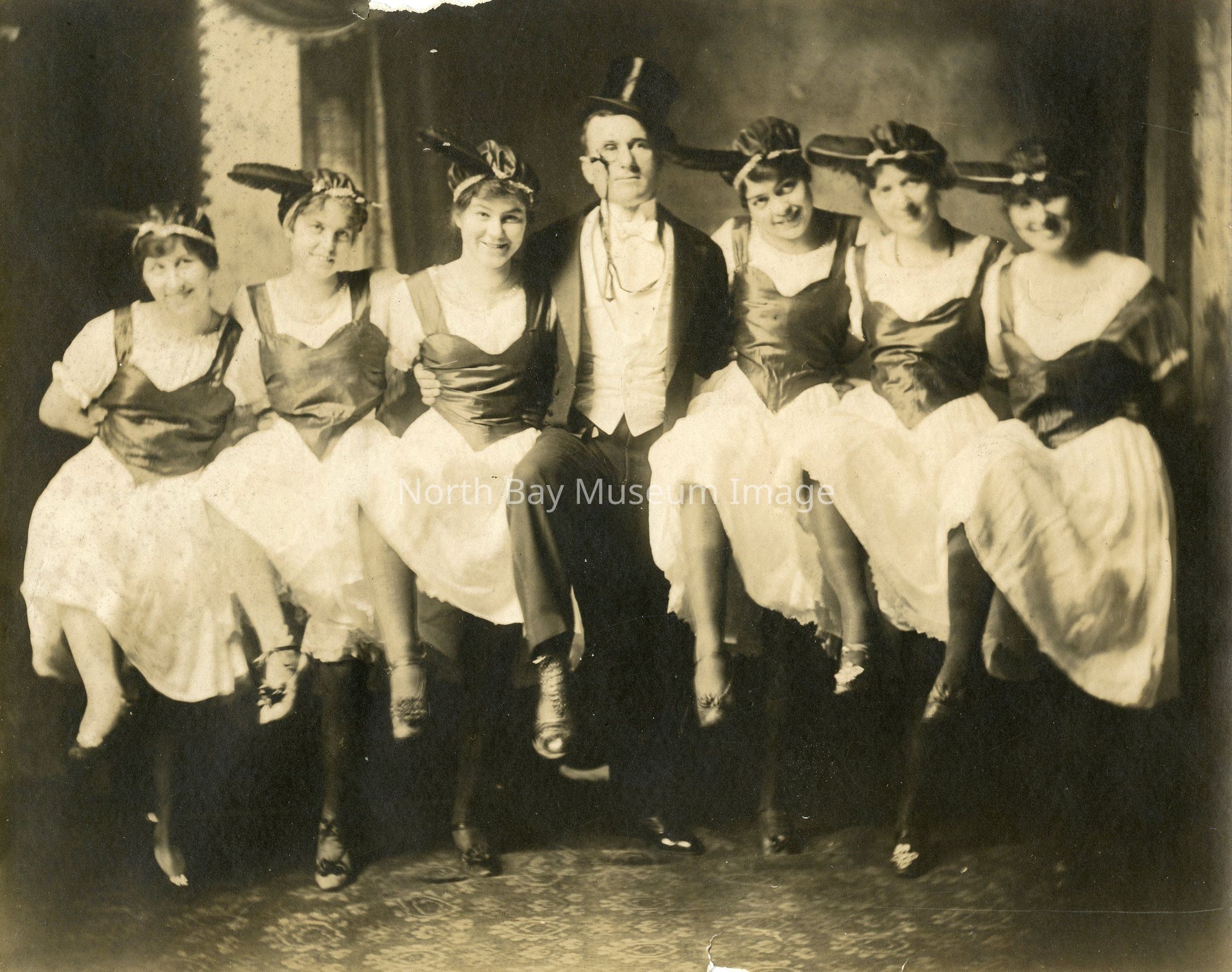 Black and white photographic print -man dressed in black tuxedo and top hat -with 6 dancing girls -two torn sections along top edge of print and one along lower edge -back of print shows significant adhesive damage
