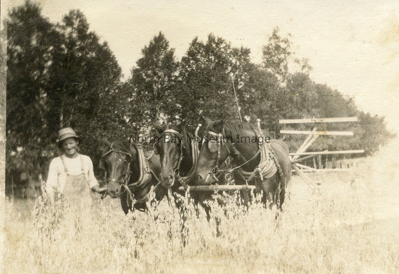 Man with Team of Horses - black and white photograph - shows a man with a team of three horses pulling a haying machine - trees line the background