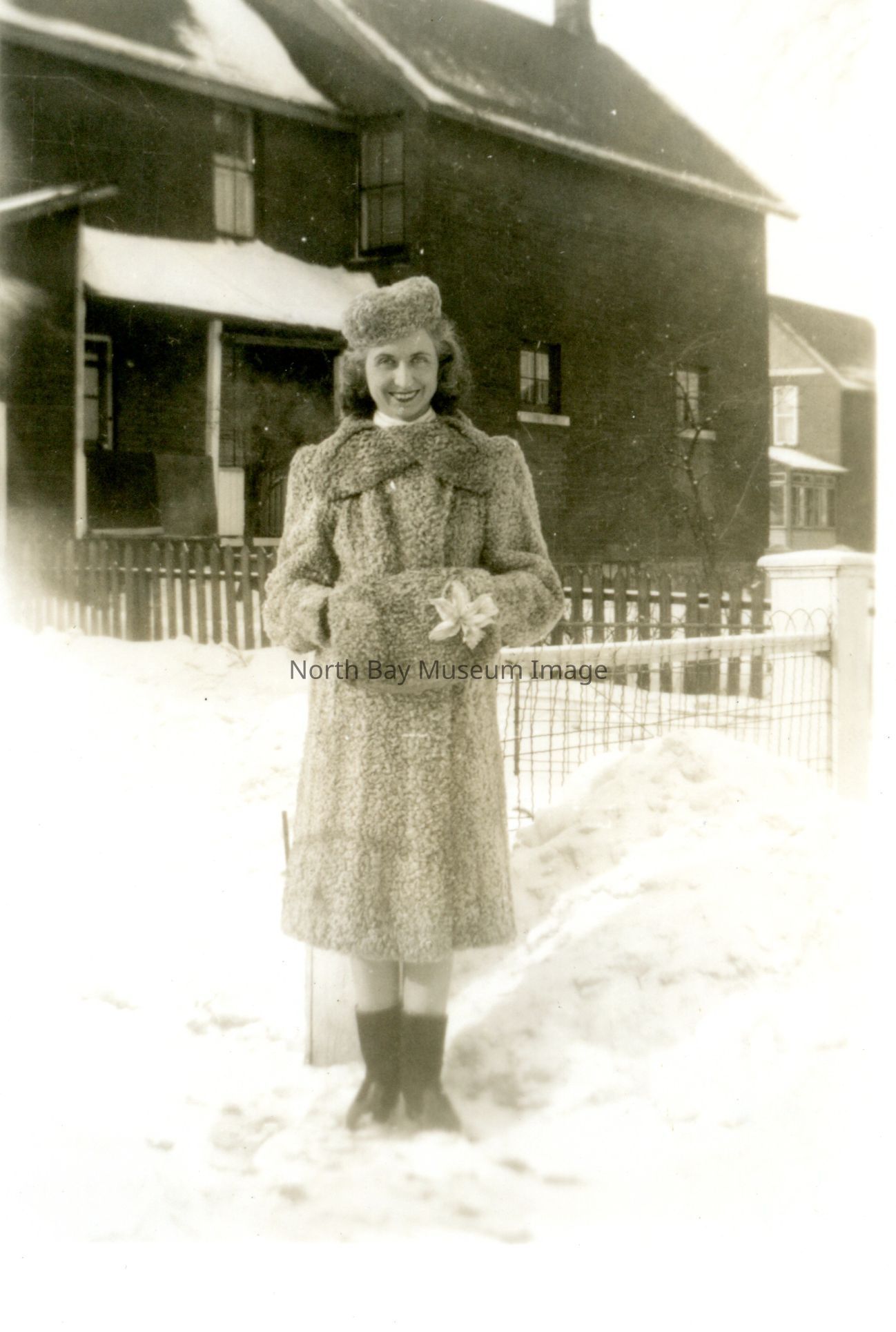 Photograph of Marjorie Wright, humane society founder, in dressand jacket in front of house. It appears to be winter.