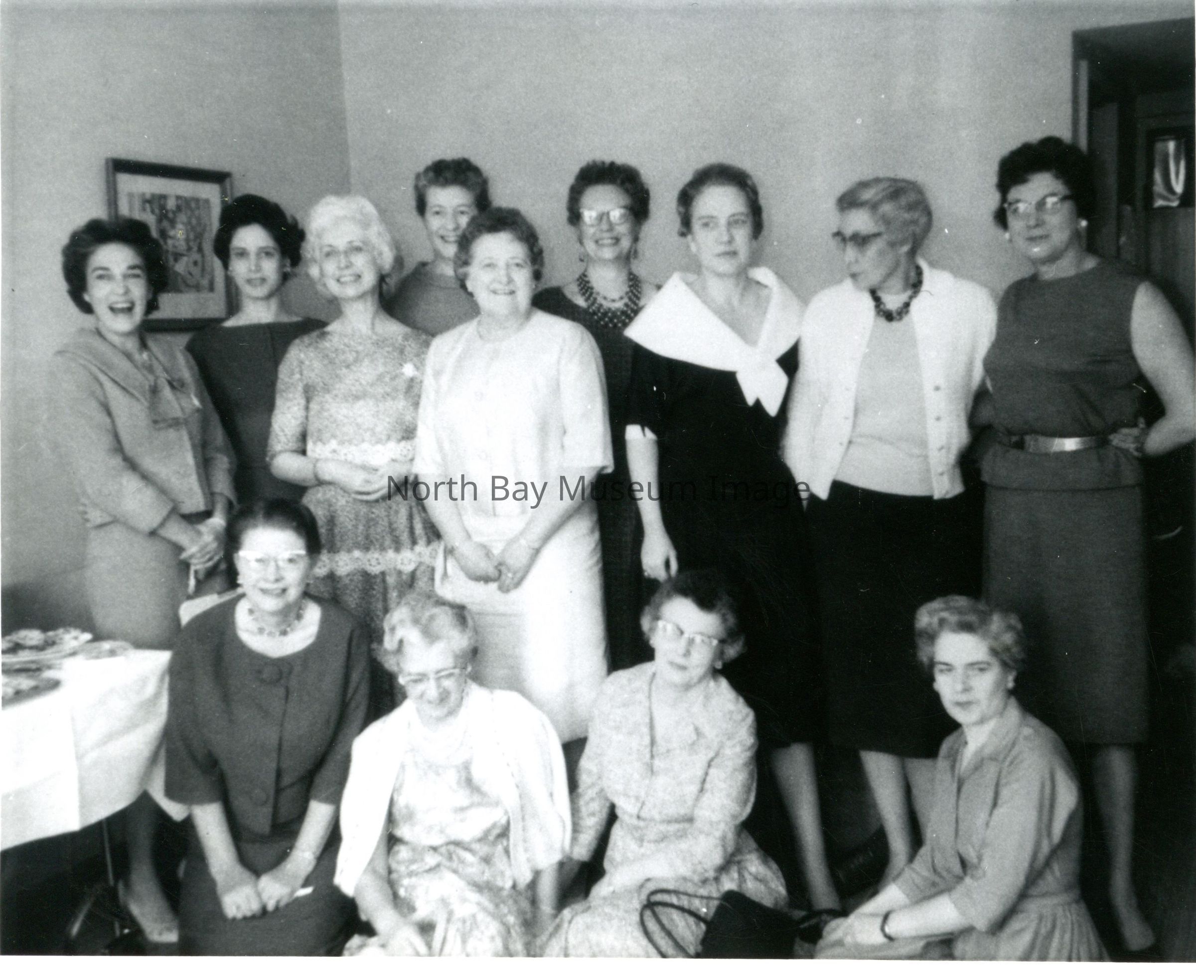 Photo of Marjorie Wright (third from left in back row) when older with group of women in her home.