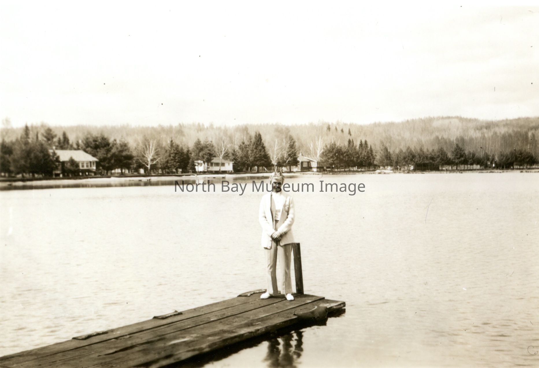 Photo of Marjorie Wright when older standing on the end of a dock.