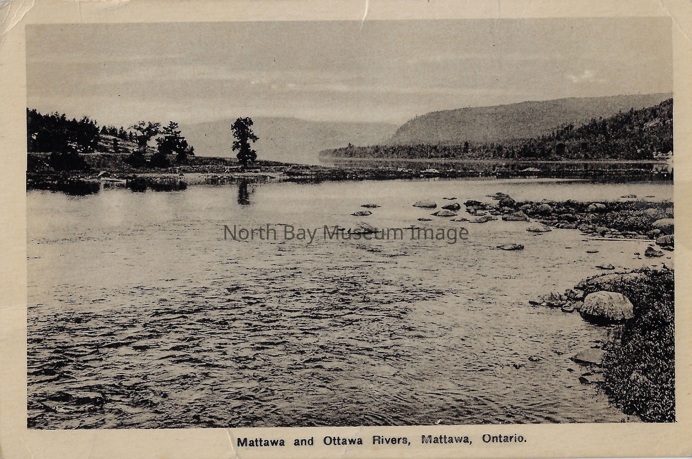 This is a black and white postcard. This is a landscape postcard. The photo was taken from down by the water looking out at the body of water, the islands in the water and the forested area lining the water. The inscriptions are: "Mattawa and Ottawa Rivers, Mattawa, Ontario."Date(s) of Creation