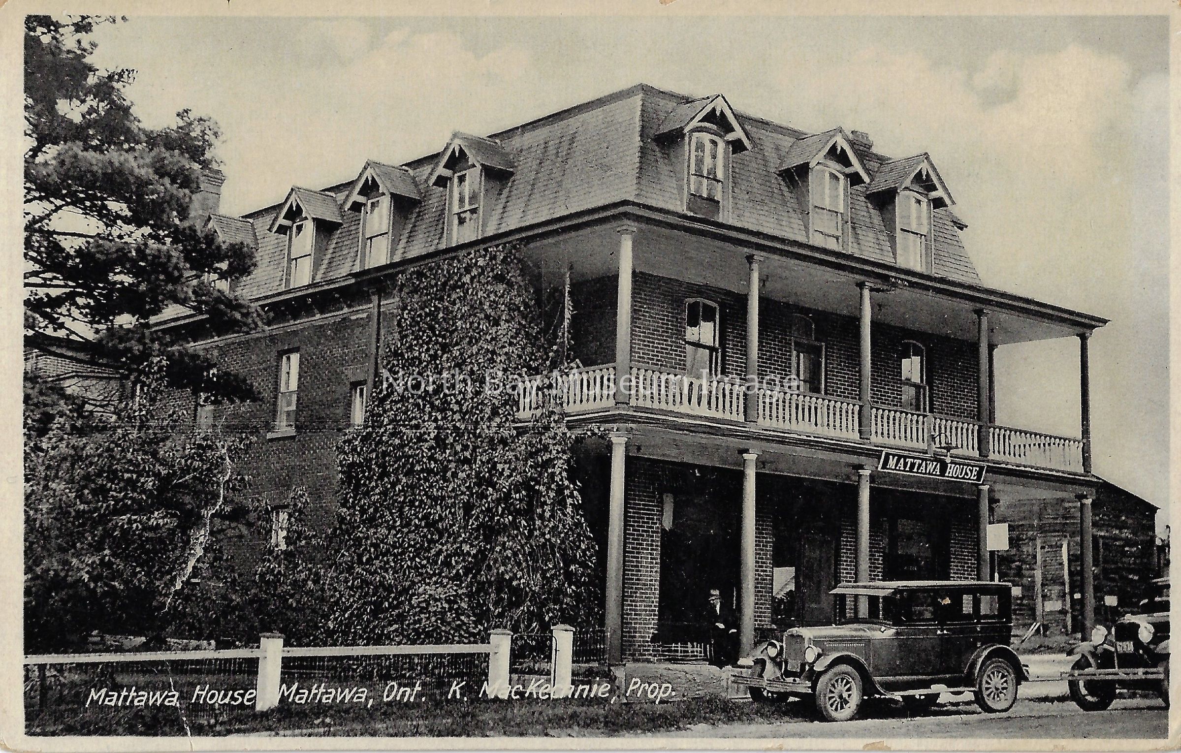 This is a black and white postcard. The postcard shows the Mattawa House. The Mattawa House is a grand 2 storey building. Windows line the roof of the building, as well as along the building. There are two old fashion cars parked in front of the house. There are also large trees and bushes at the side of the house. The inscriptions read "Mattawa House, Mattawa, Ont. K. MacKeannie, Prop.".Date(s) of Creation