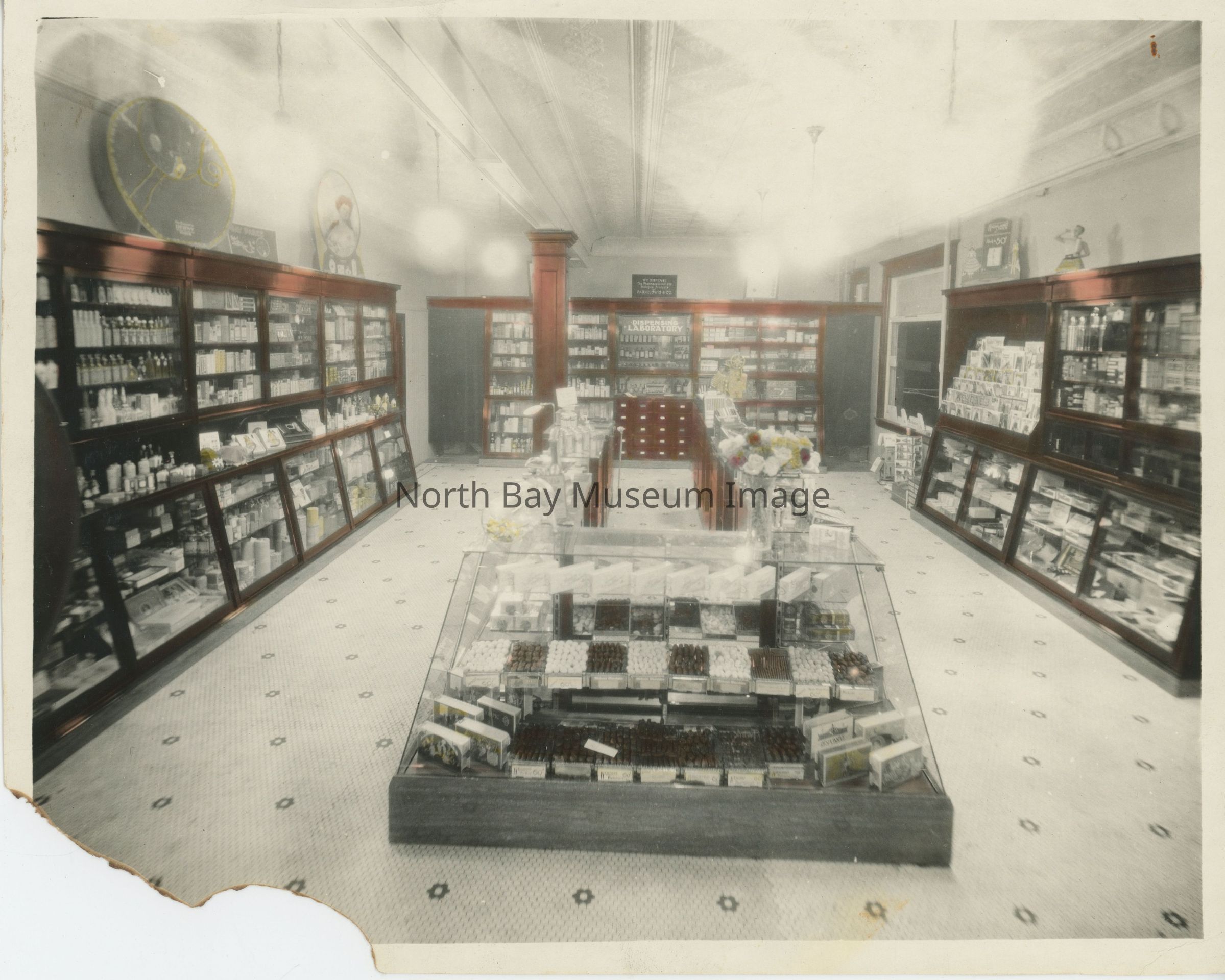 Interior shot of McDivitt's Drug store showcasing various shelves. Image is overexposed.
