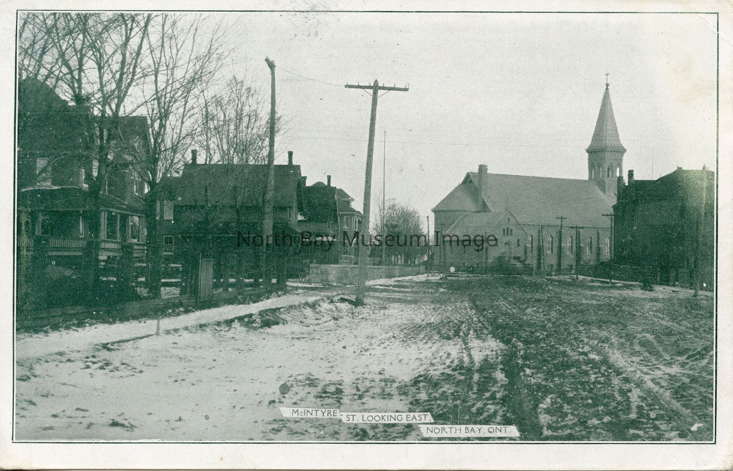 Postcard with black and white photo of McIntyre St. looking east toward Pro Cathedral with homes in front, street is unpaved