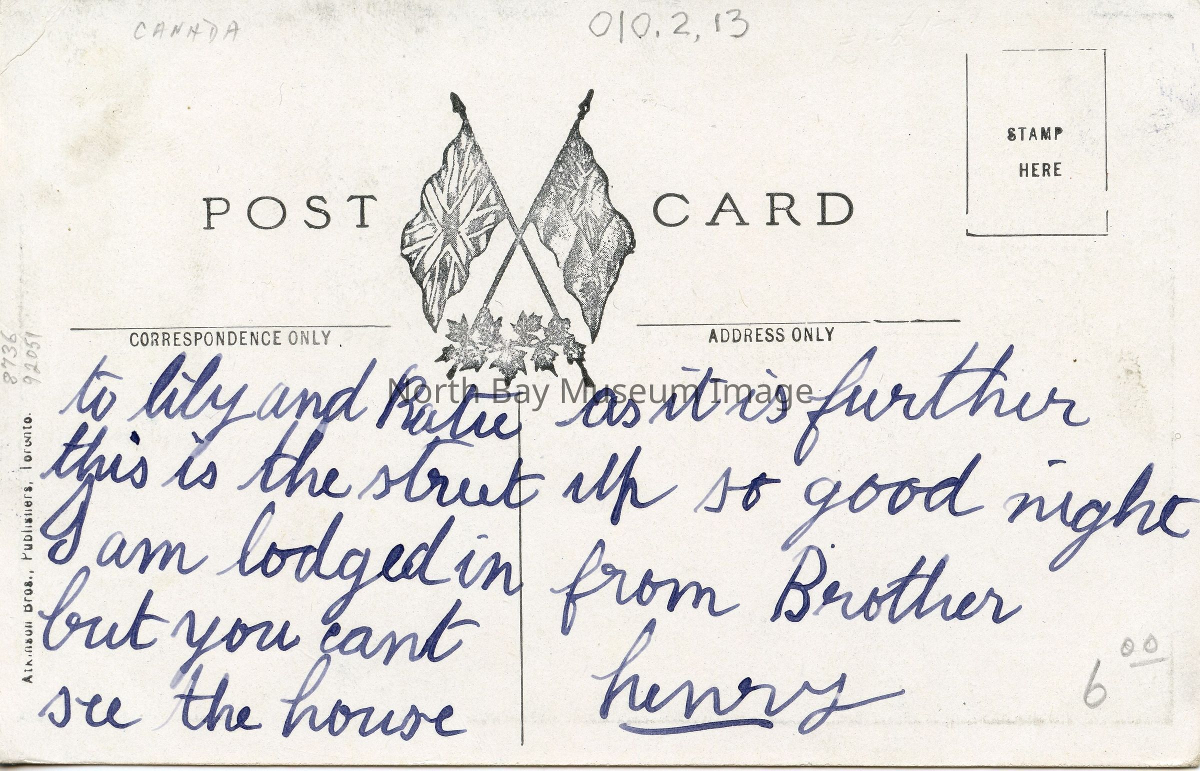 -- Message: "to Lily and Katie this is the street I am lodged in but you cant see the house as it is further up so good night from Brother Henry"