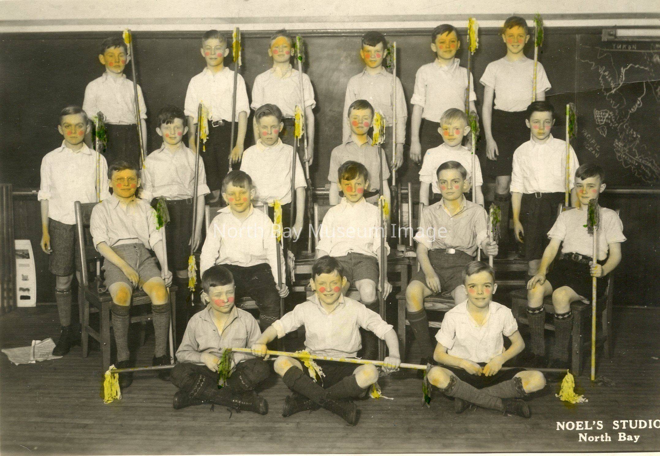 Colourized black and white print of the boys from McIntyre St. School, Boys are prepared for a drill - movement to music.
