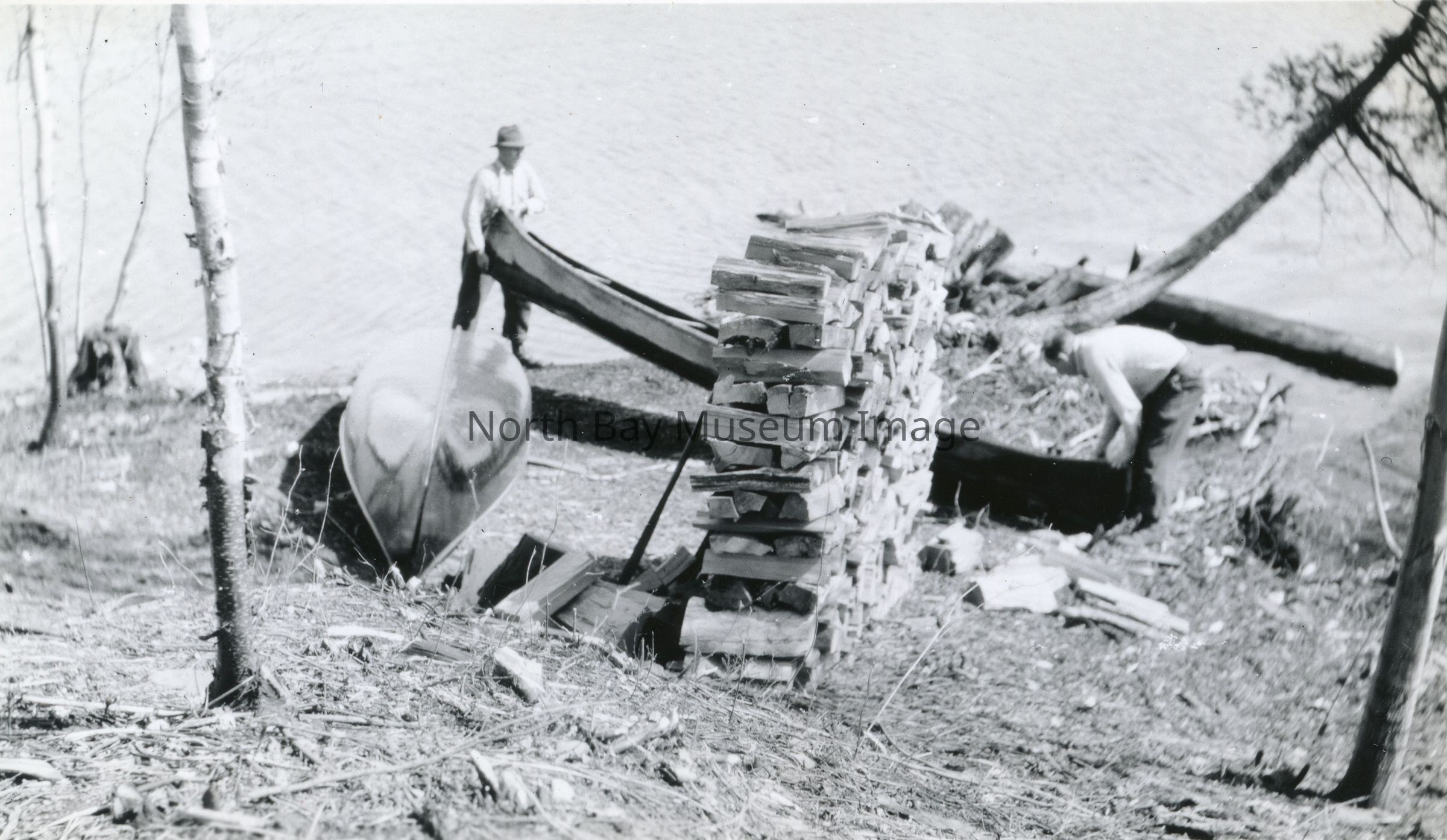 Print, Photographic - black and white photograph - picture of two men lifting a canoe - woodpile and canoe in foreground, lake in background