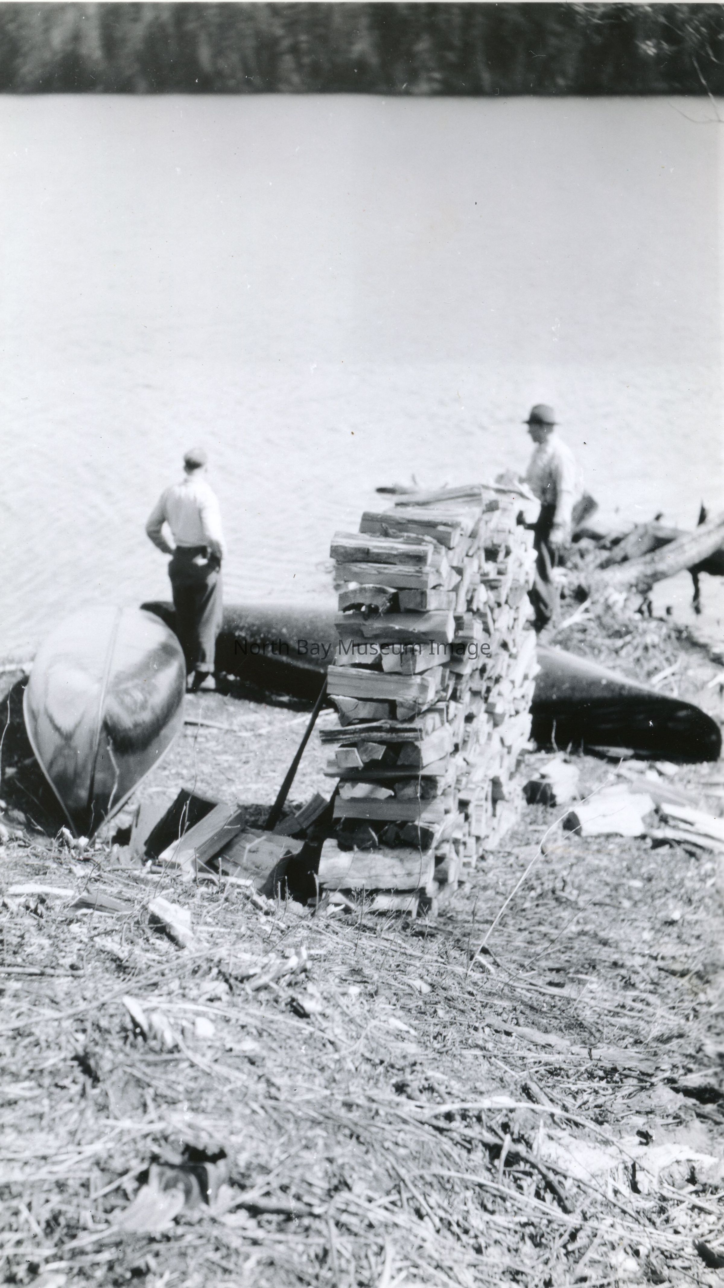 Print, Photographic - black and white photograph - picture of two men standing by lake - two canoes and a woodpile surround them