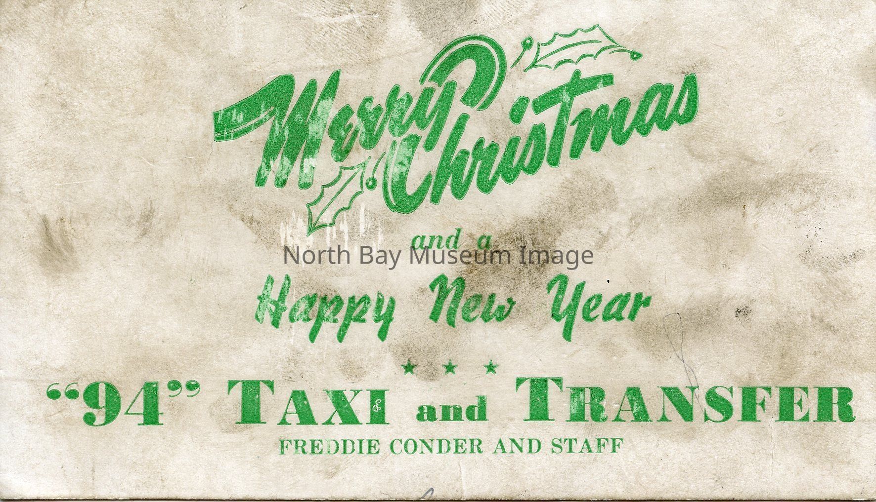 This is a white blotter. The blotter has the dimensions of 3.5 inch x 6 inch. The card reads "Merry Christmas and a Happy New Year-94." This is a Taxi and Transger, Freddie Corner and Staff card.
