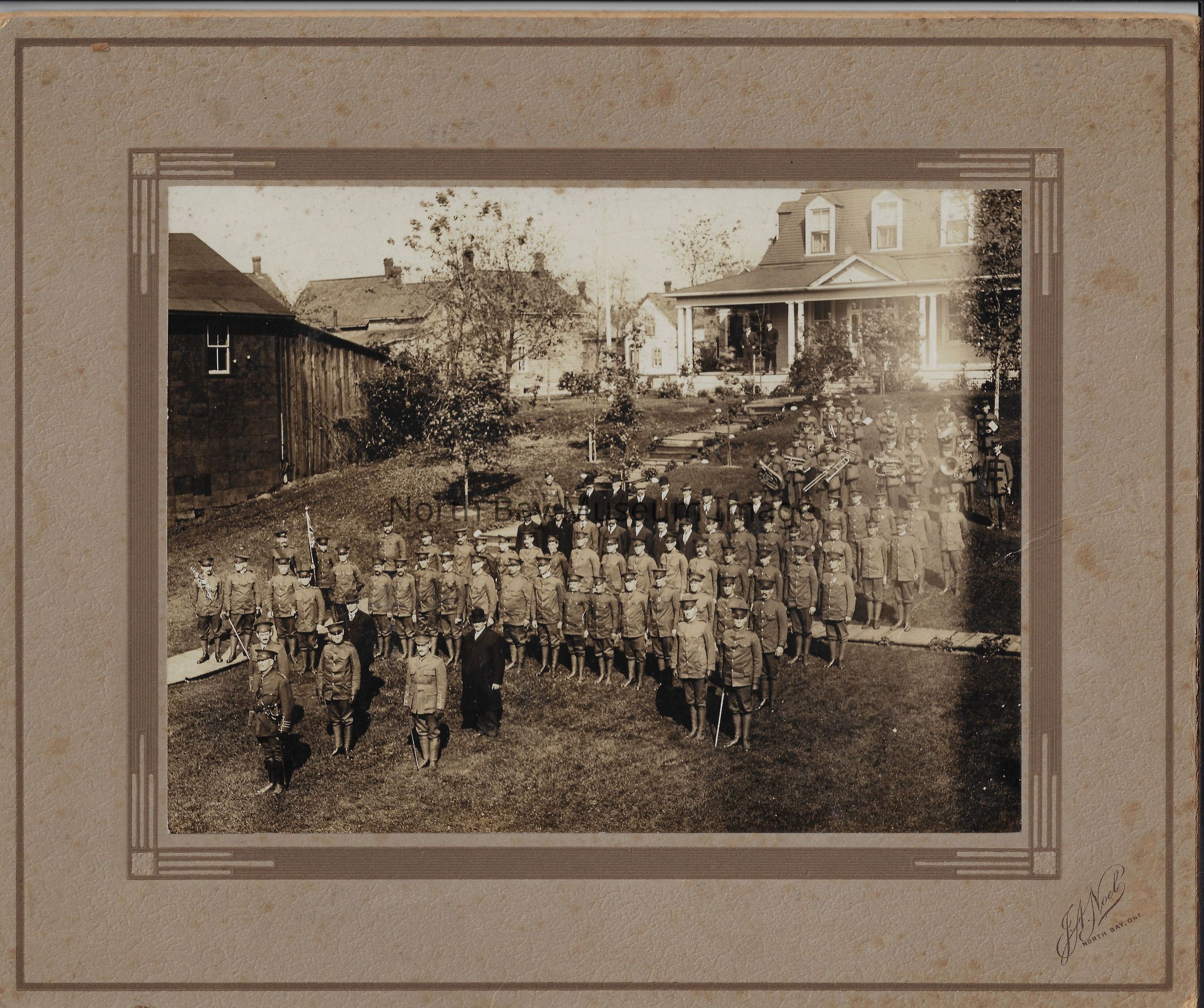 Matted print by J.A. Noel shows "Home Guard", on parade in uniform on the lawn of John Ferguson's home.