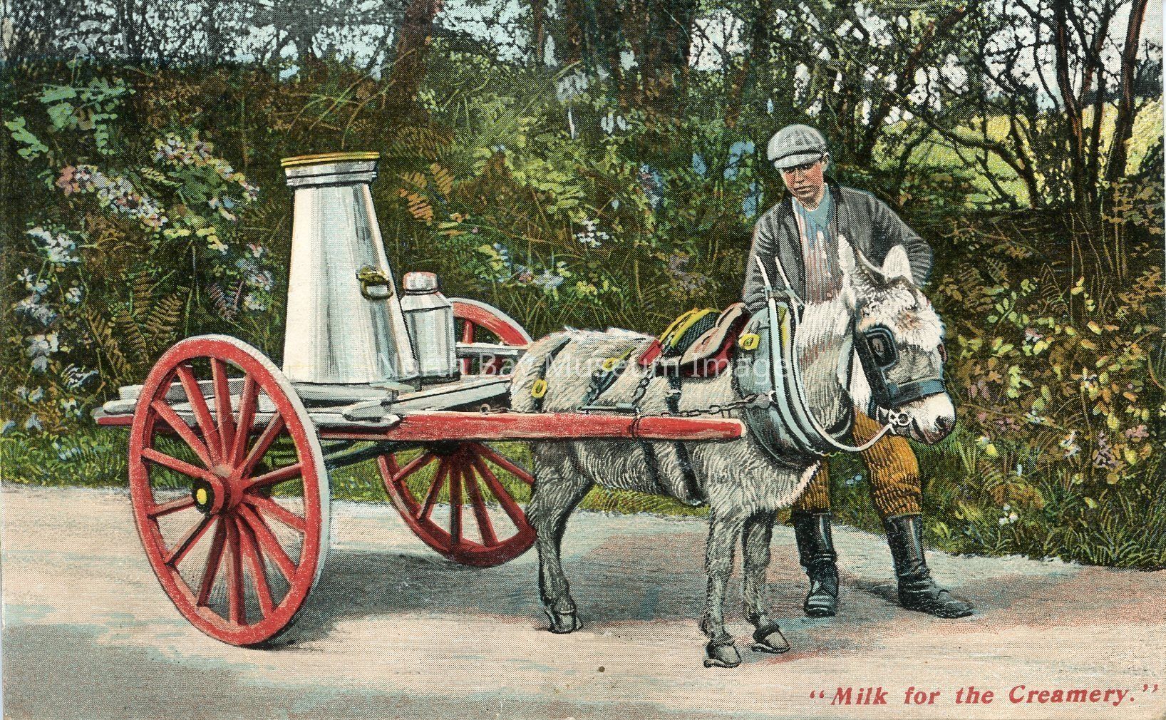 This is a coloured postcard. This postcard is from the N.P.O. Belfast, Inland 1/2d Stamp, Foreign id. On the front of the postcard is a illustrated picture of a man with donkey cart. In the background there is lots of trees. At the bottom of the postcard in red text says "milk for the creamery."