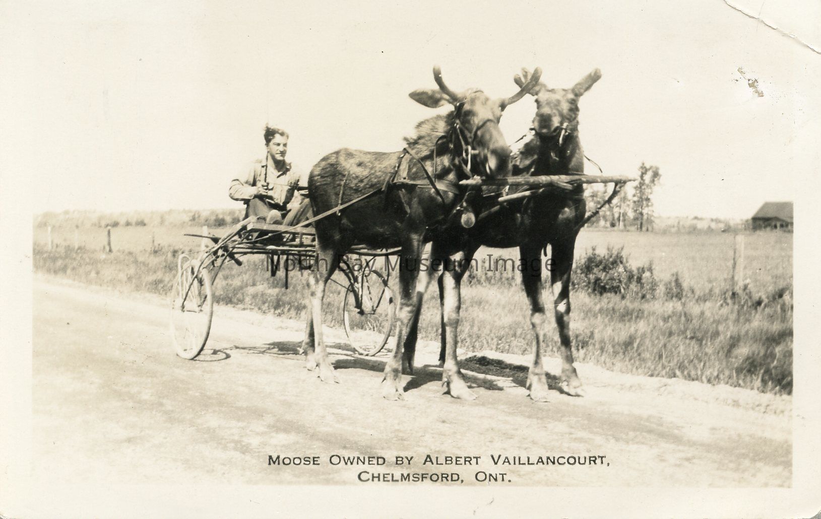 This is a black and white image of two moose harnessed to a sulky with a young, male rider on a country road. A farm house or a barn can be seen at the far right of the postcard. The text "Moose owned by Albert Vaillancourt, Chelmsford, O.N." is written at the bottom of the card in black ink. The postcard has a glossy finish.