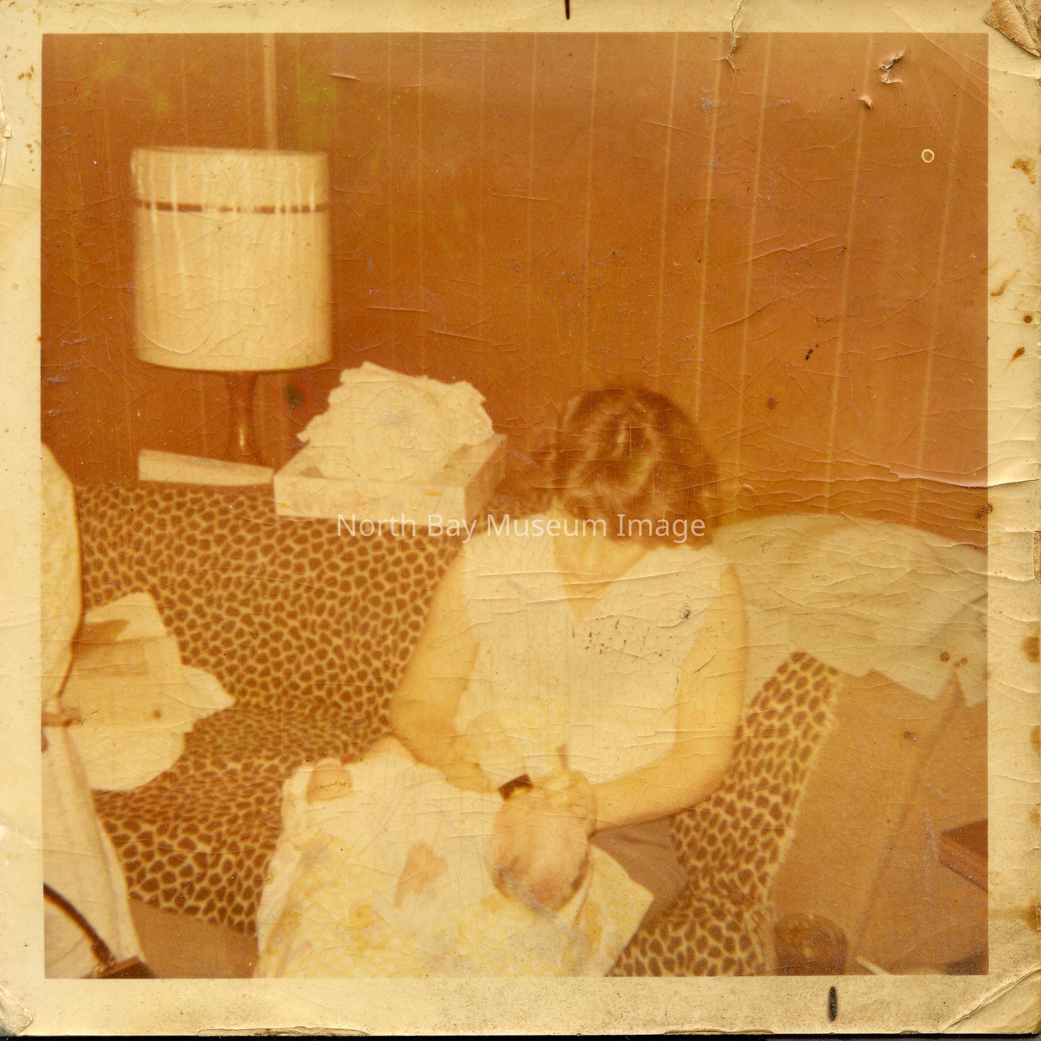 A photo of a woman feeding a bottle to a baby. This may be Birdie feeding a Rousseau Triplet but the yellow hue of the photo and the decor of the scene suggests a later date. Potentially, this is Corrine feeding her daughter Kendel Sullivan or it may be Geraldine feeding her own child.