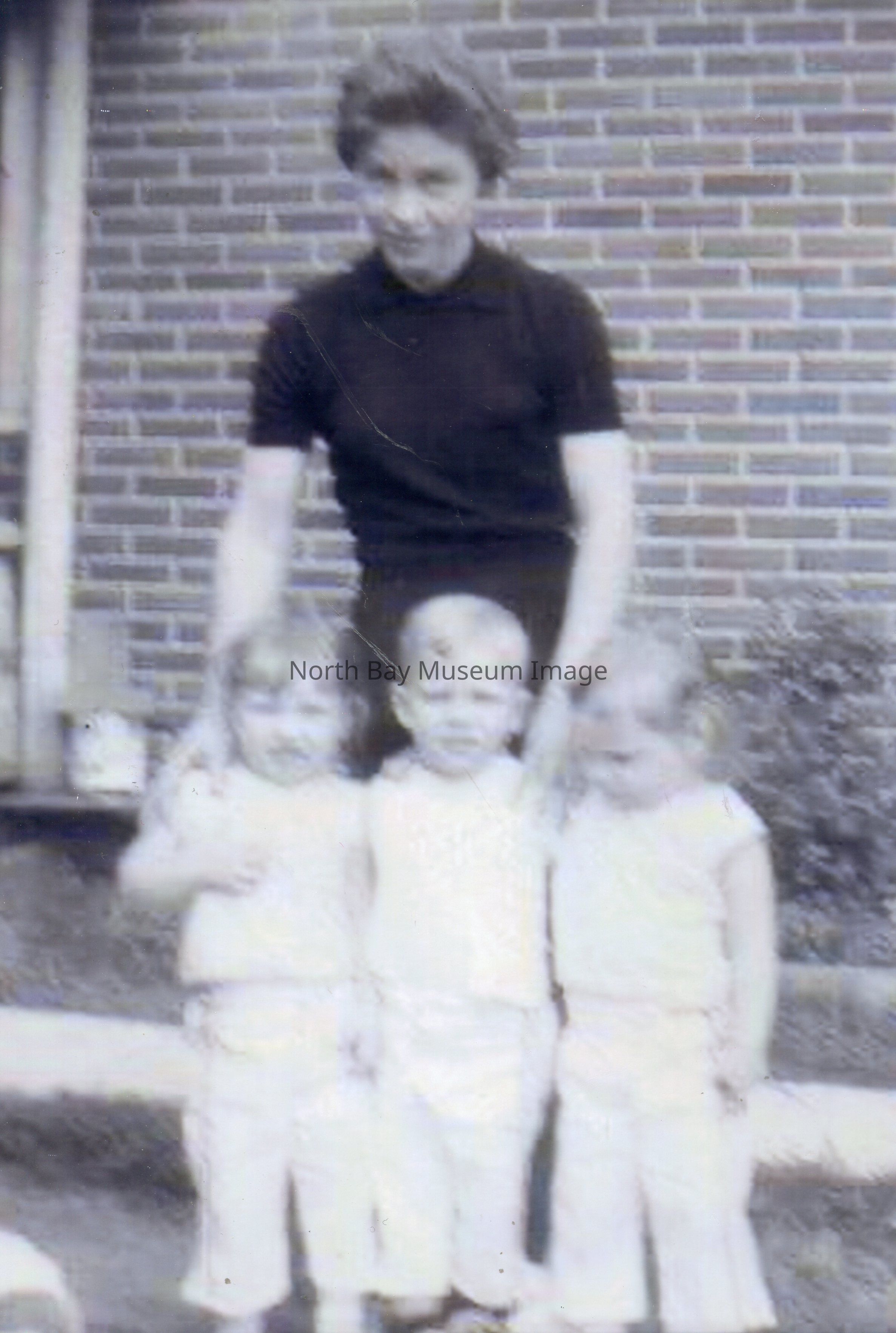 Birdie stands with her triplets presumably in front of their new house. Seems to be a modern reprint of a lower quality photo, likely a private family photo rather than for the Nugget.
