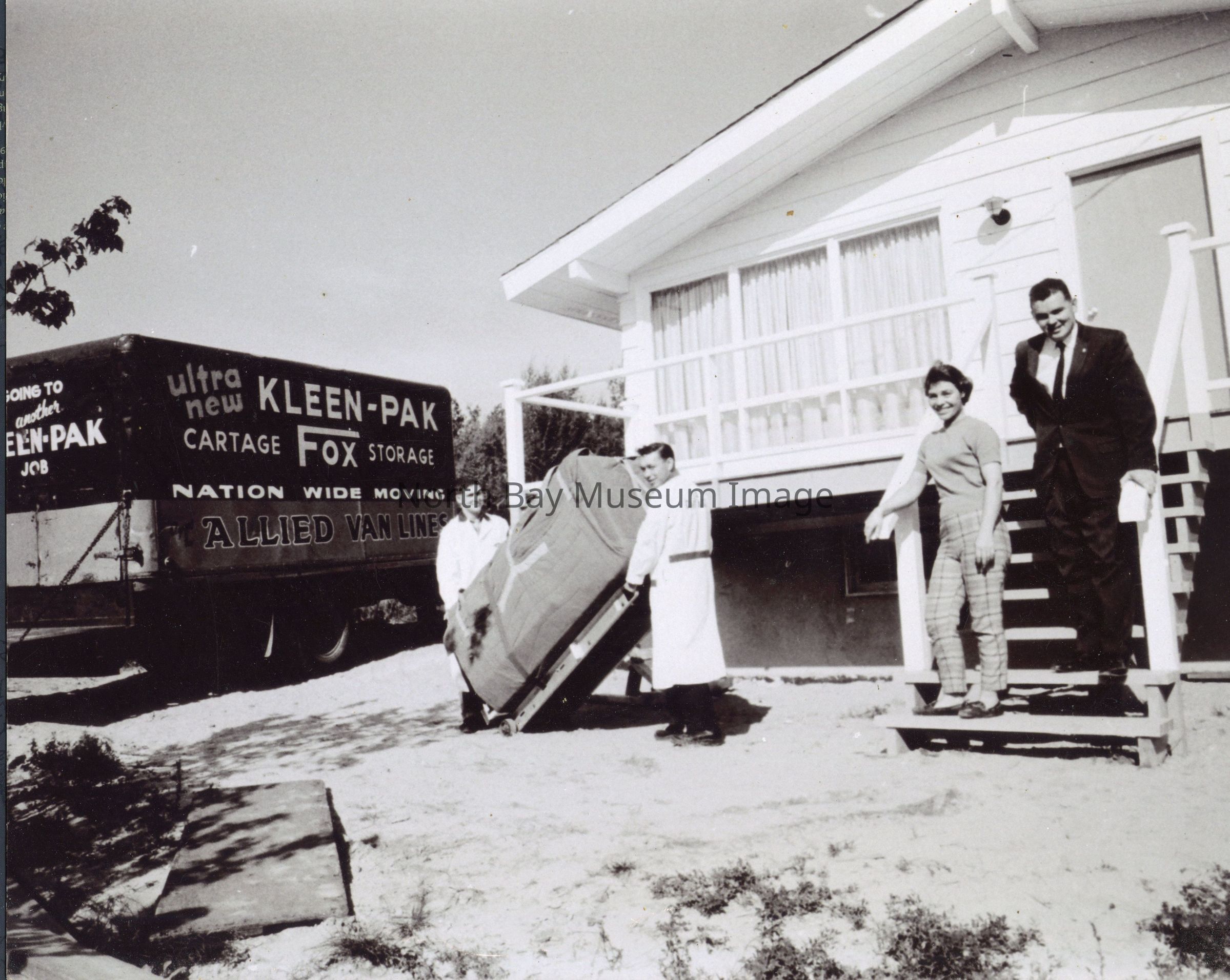 From left, Fox Cartage employees Frank Newman and Bob Lalande carry a refrigerator into the newly built home of Birdie Rousseau who stands beside Fox Cartage sales representative Dan Burns. The photo was taken for the Nugget.