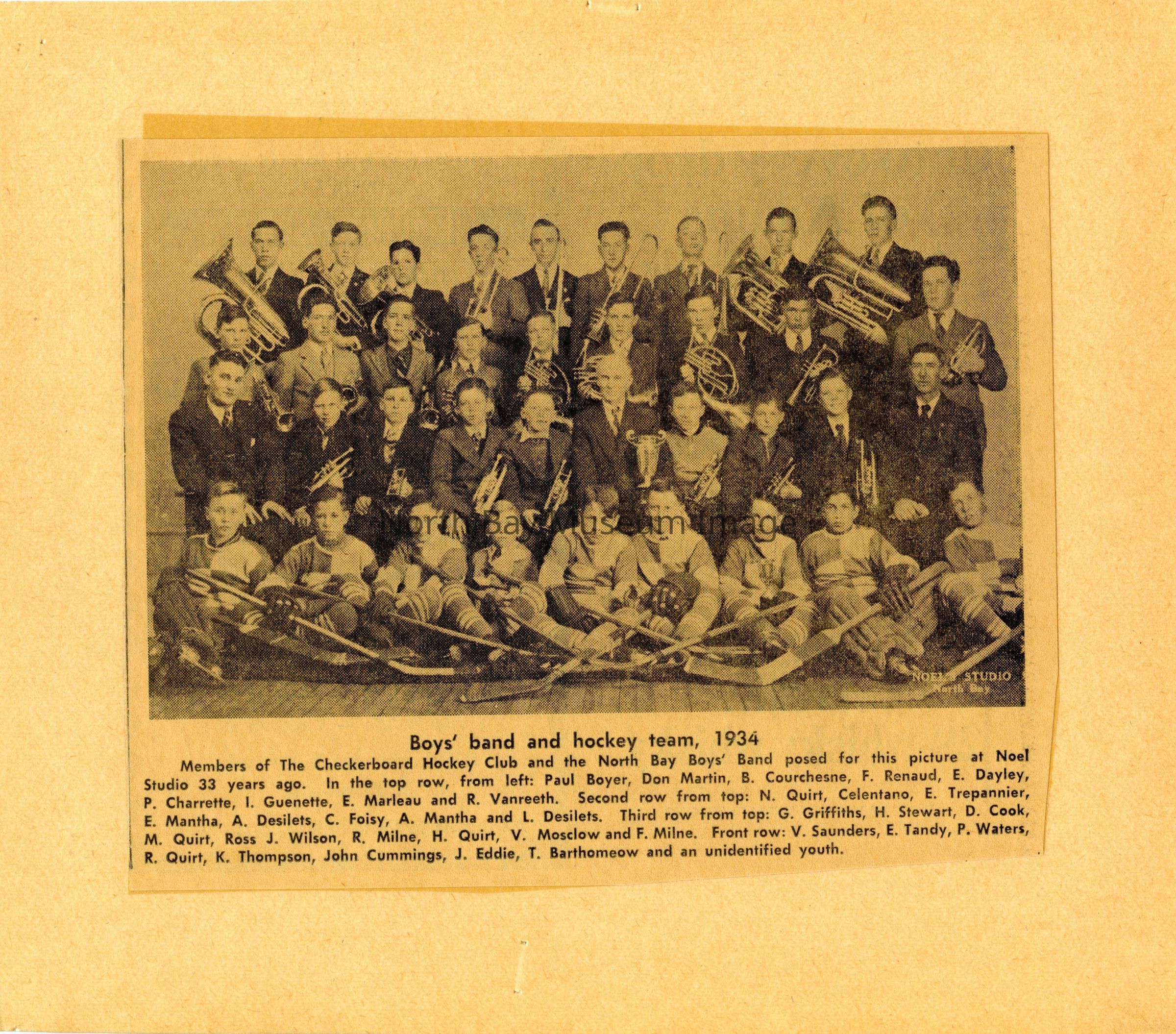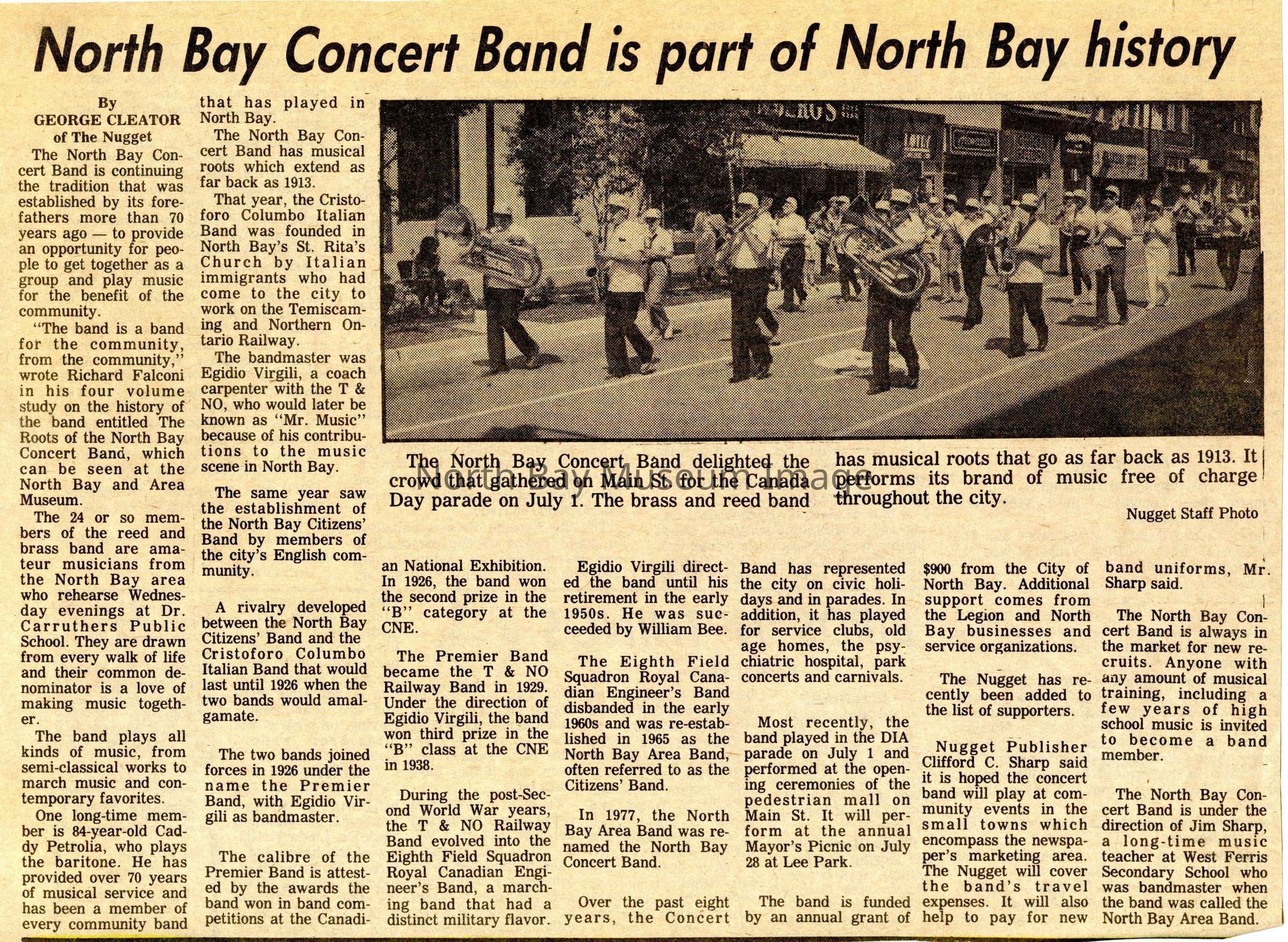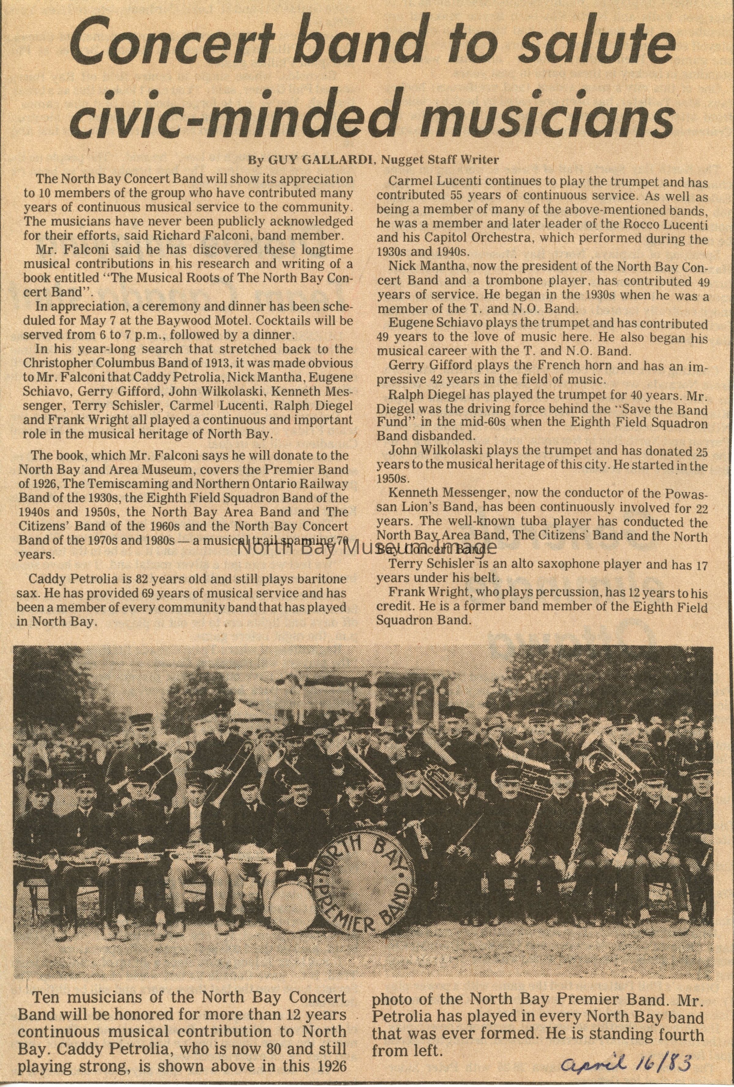 Various documents and newspaper clippings concerning bands in North Bay. Includes correspondence between Pam Handley, North Bay Museum Curator and Gerry Dyke, Centennial Public School Teacher regarding Maryann Brown's research on bands in North Bay. Brief biography of music journalists and musicians: John Size, CKAT radio and Britt Jessup, North Bay Nugget reporter and Leo Lamothe.Date(s) of Creation