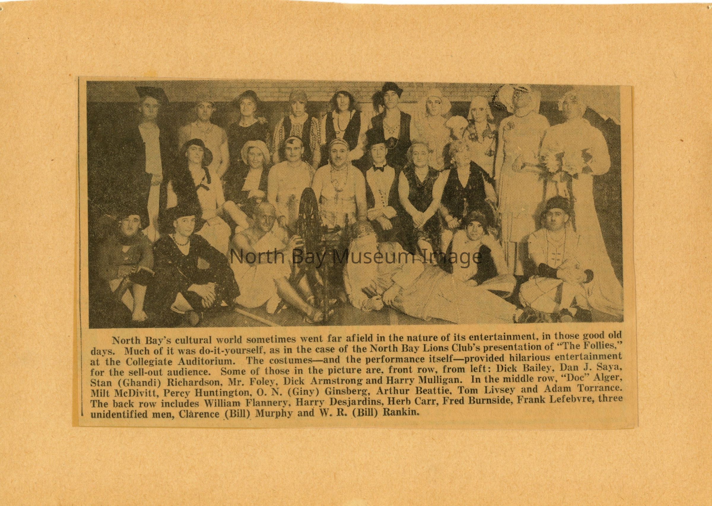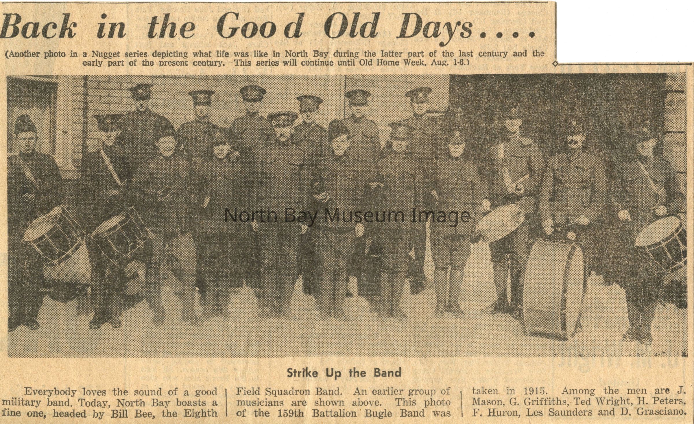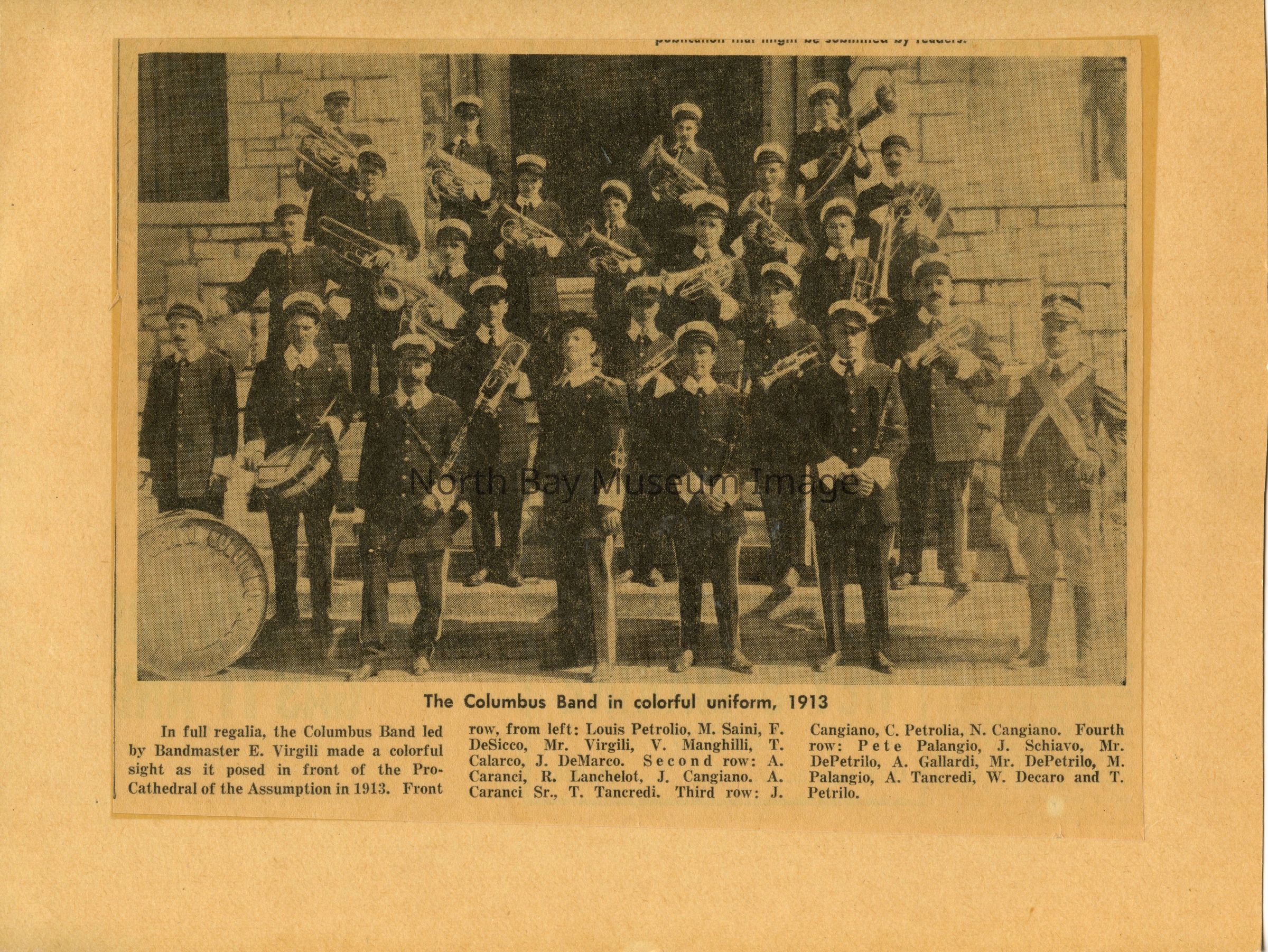 Various documents and newspaper clippings concerning bands in North Bay. Includes correspondence between Pam Handley, North Bay Museum Curator and Gerry Dyke, Centennial Public School Teacher regarding Maryann Brown's research on bands in North Bay. Brief biography of music journalists and musicians: John Size, CKAT radio and Britt Jessup, North Bay Nugget reporter and Leo Lamothe.Date(s) of Creation
