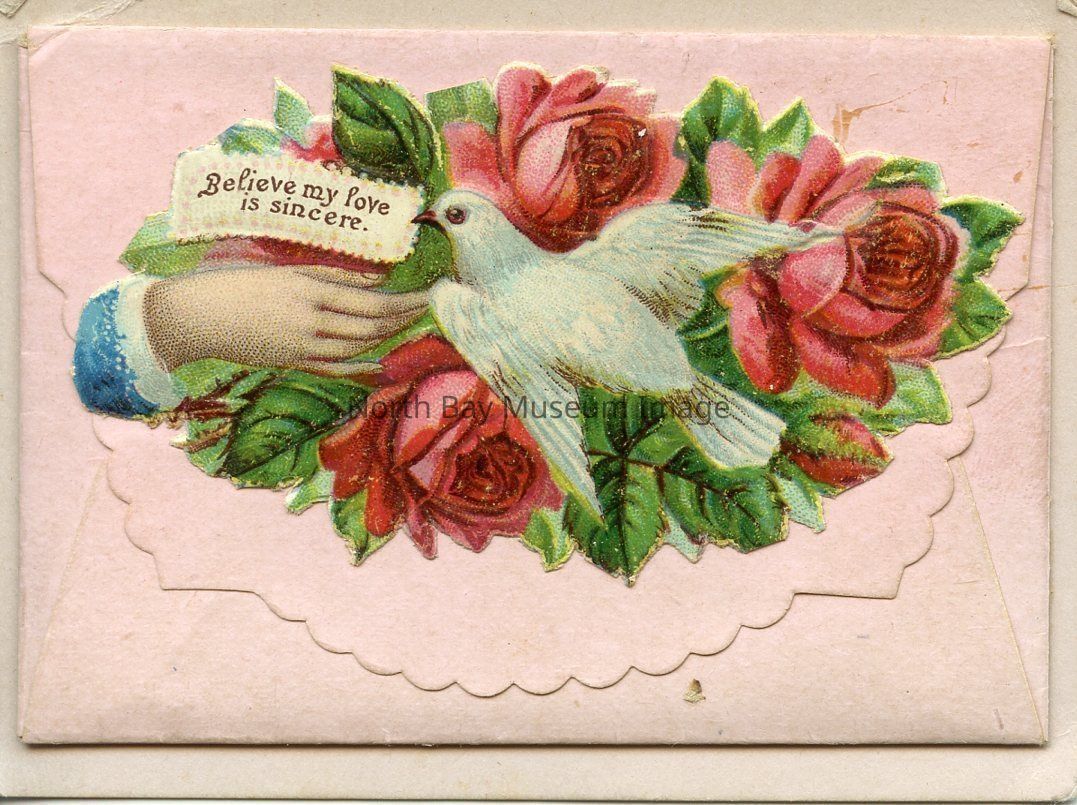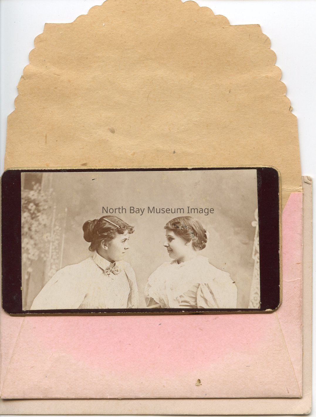 A Small (9 cm x 6 cm) pink envelope with scalloped edge. The envelope has an image of a white dove and red roses on the edges. There is an inscription that says "Believe my love is sincere" written on it. There is also a black and white photograph inside the envelope of two women looking at each other. The woman on the right has her hand on the woman on the left's shoulder.