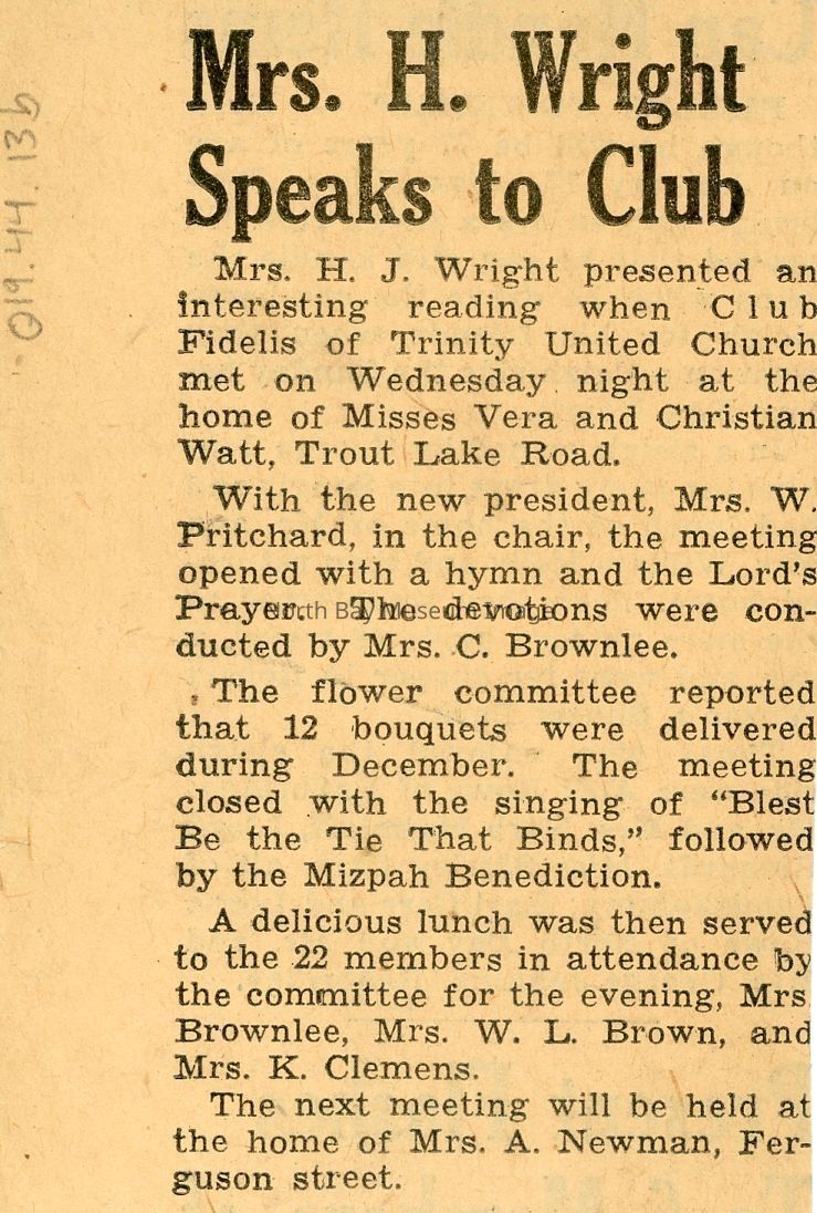 b- Article about Mrs. H.J. Wright presenting a reading at Trinity United Church to Club Fidelis