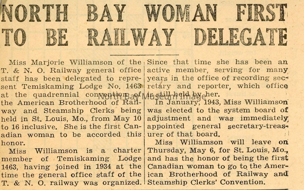 d- Article about Marjorie Williamson (later Wright?) who was the first to be a female railway delegate as a charter member of the Temiskaming Lodge since 1934