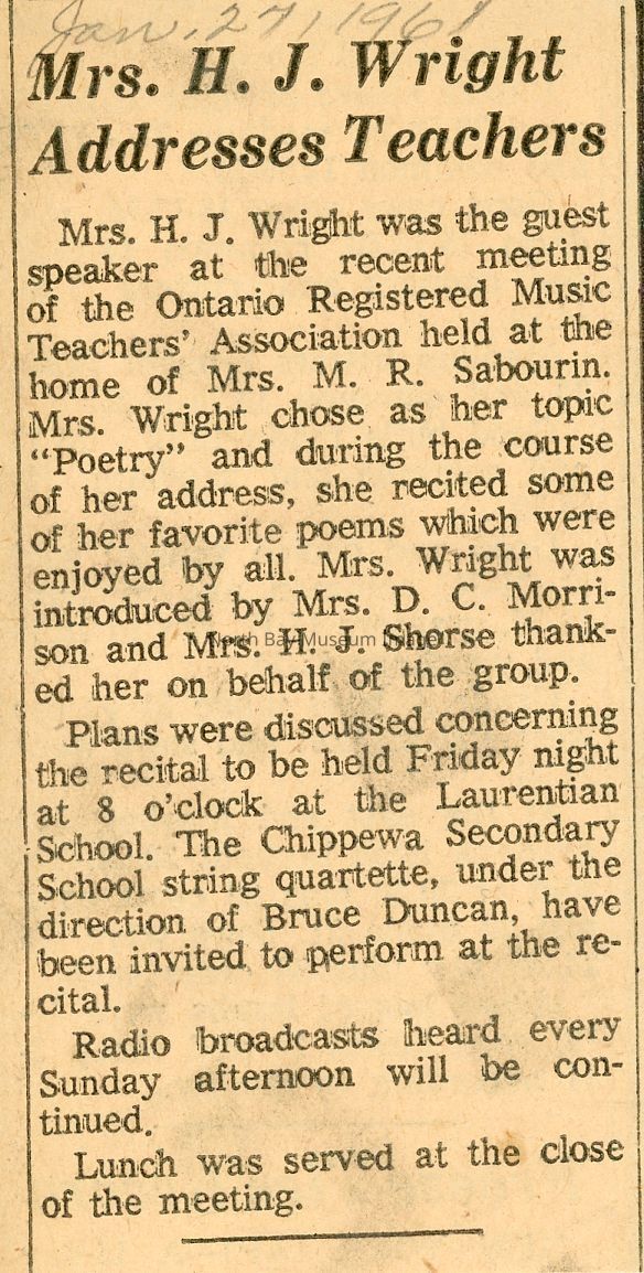 e- Article about speech by Mrs H.J. Wright at the Ontario Registerd Museic Teacher's Association on poetry with poems recited.