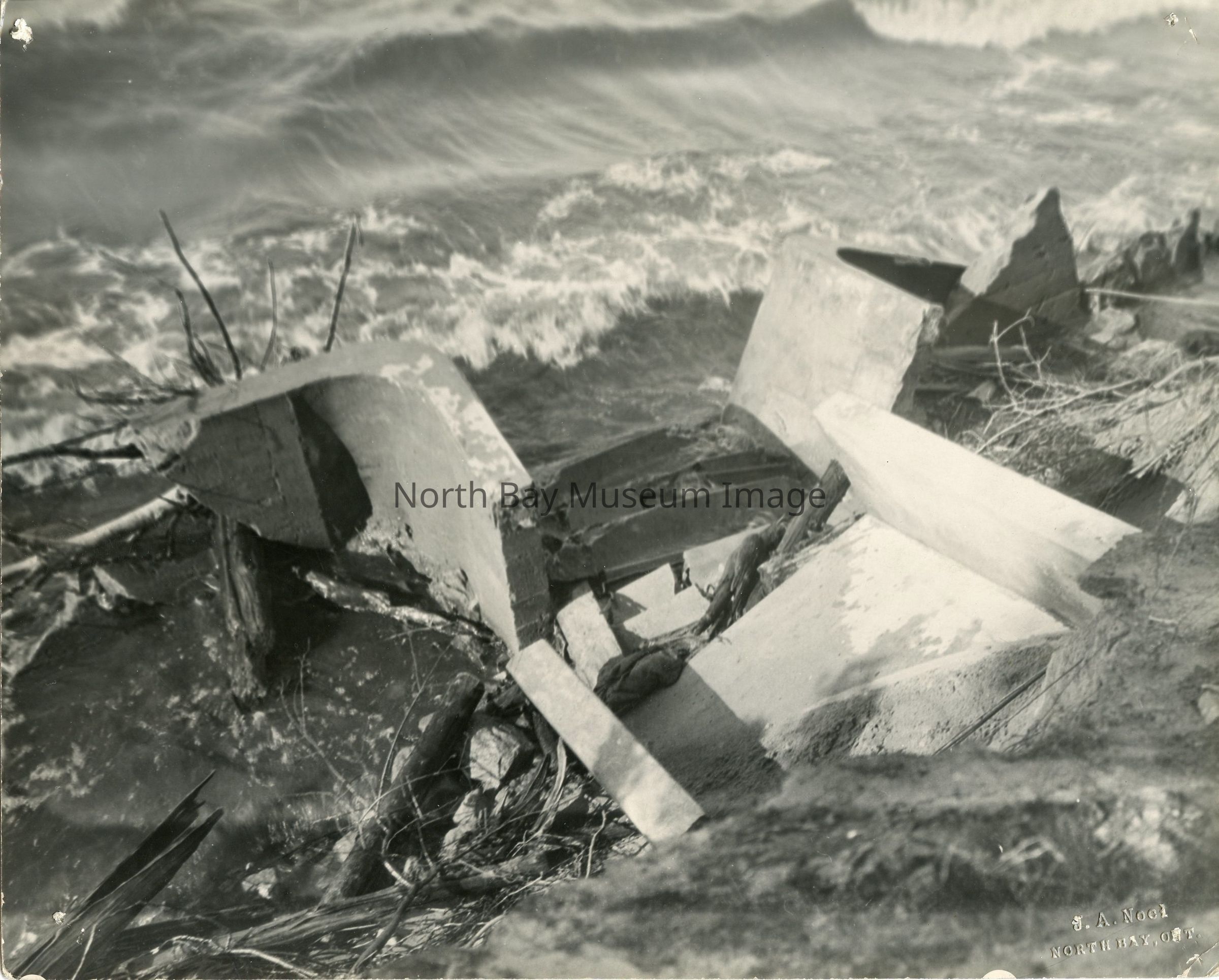 -Photograph, black and white -Part of broken breakwall. -Location uncertain. -During flood of 1928 or 1933. -Taken by J.A. Noel. -Reverse, T & NO, front of Geo. W. Lee's. -Return to Dr. Oliver.