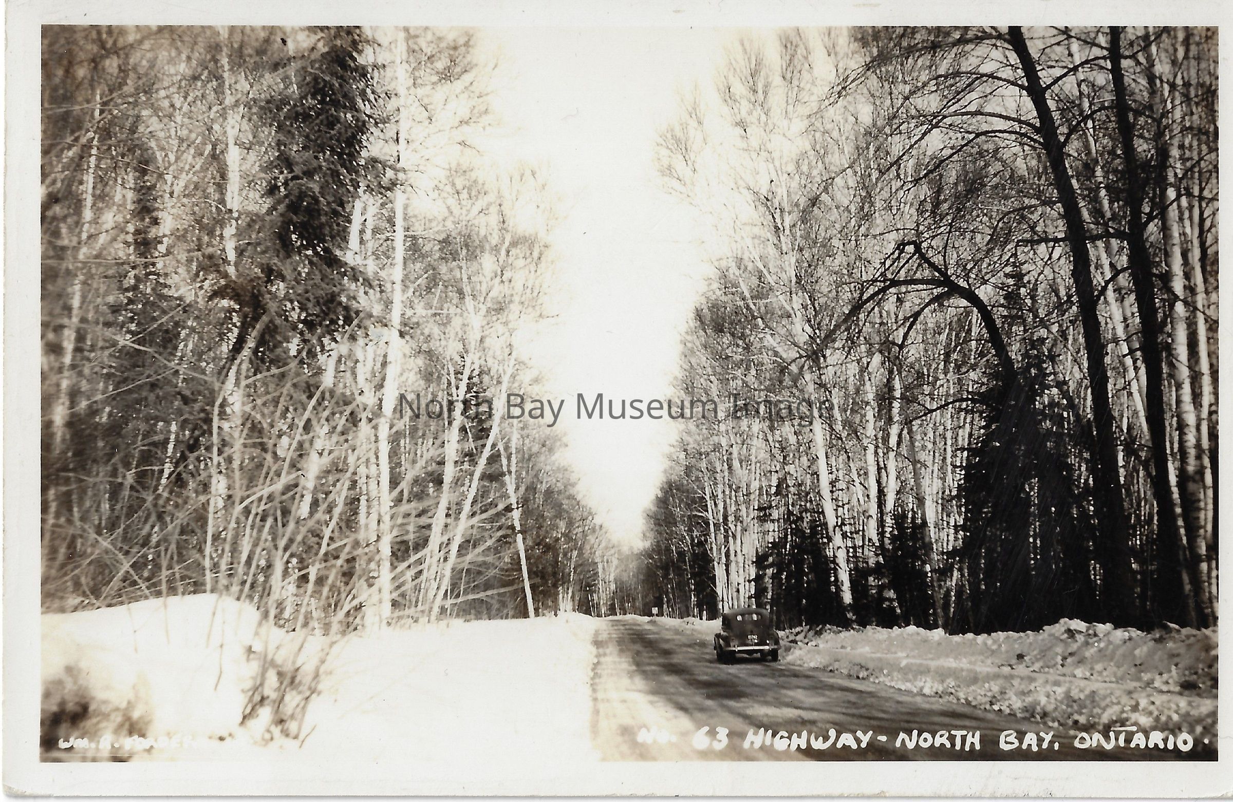 Postcard showing picture of car driving down snowy road. There is only one small car driving down the snowy road. On either side of the road is snow covered trees. The Inscription reads: "Wm. R. Forder No. 63 Highway - North Bay, Ontario".Date(s) of Creation