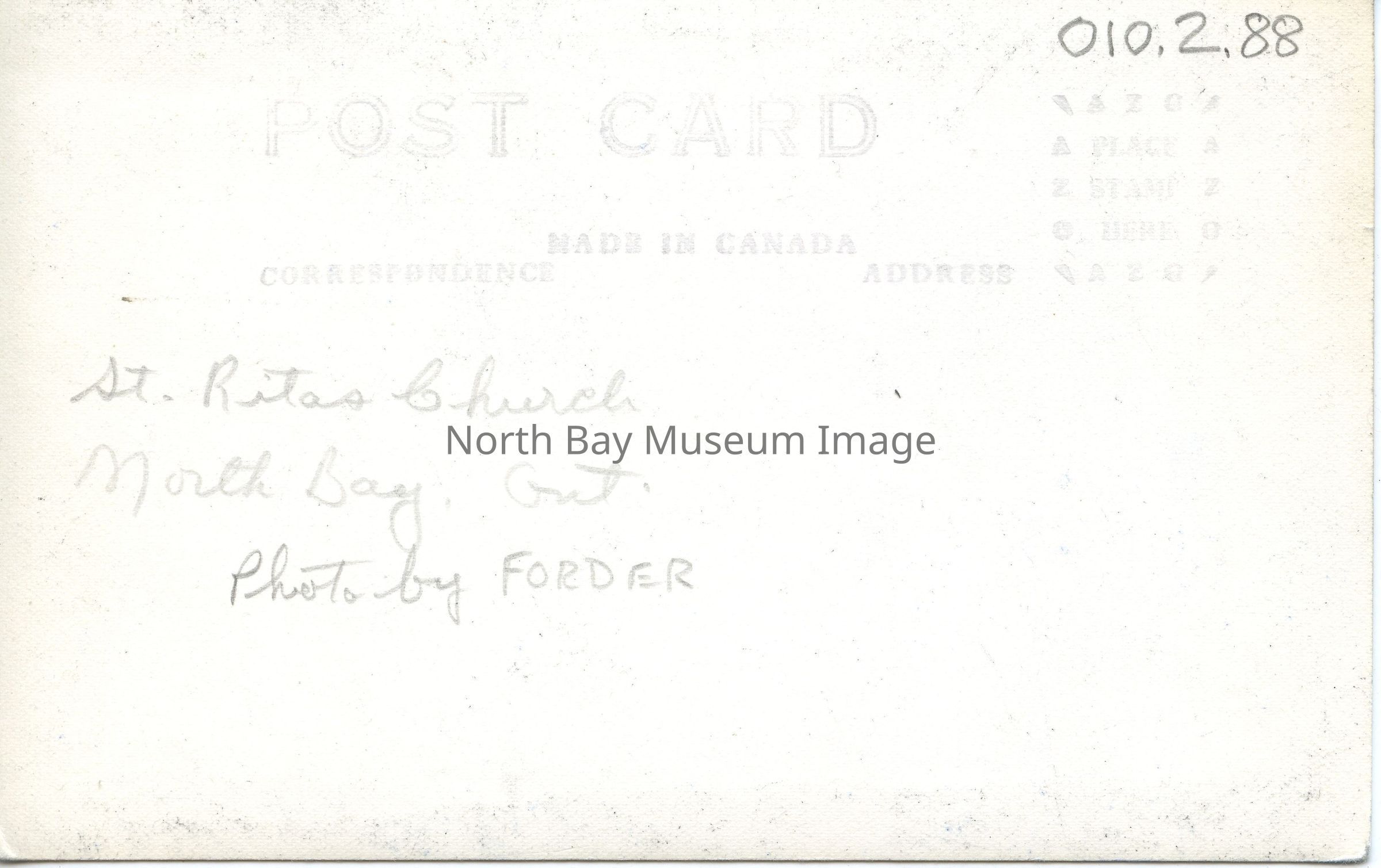 handwritten--St. Rita's Church, North Bay, Ont. Photo by Forder