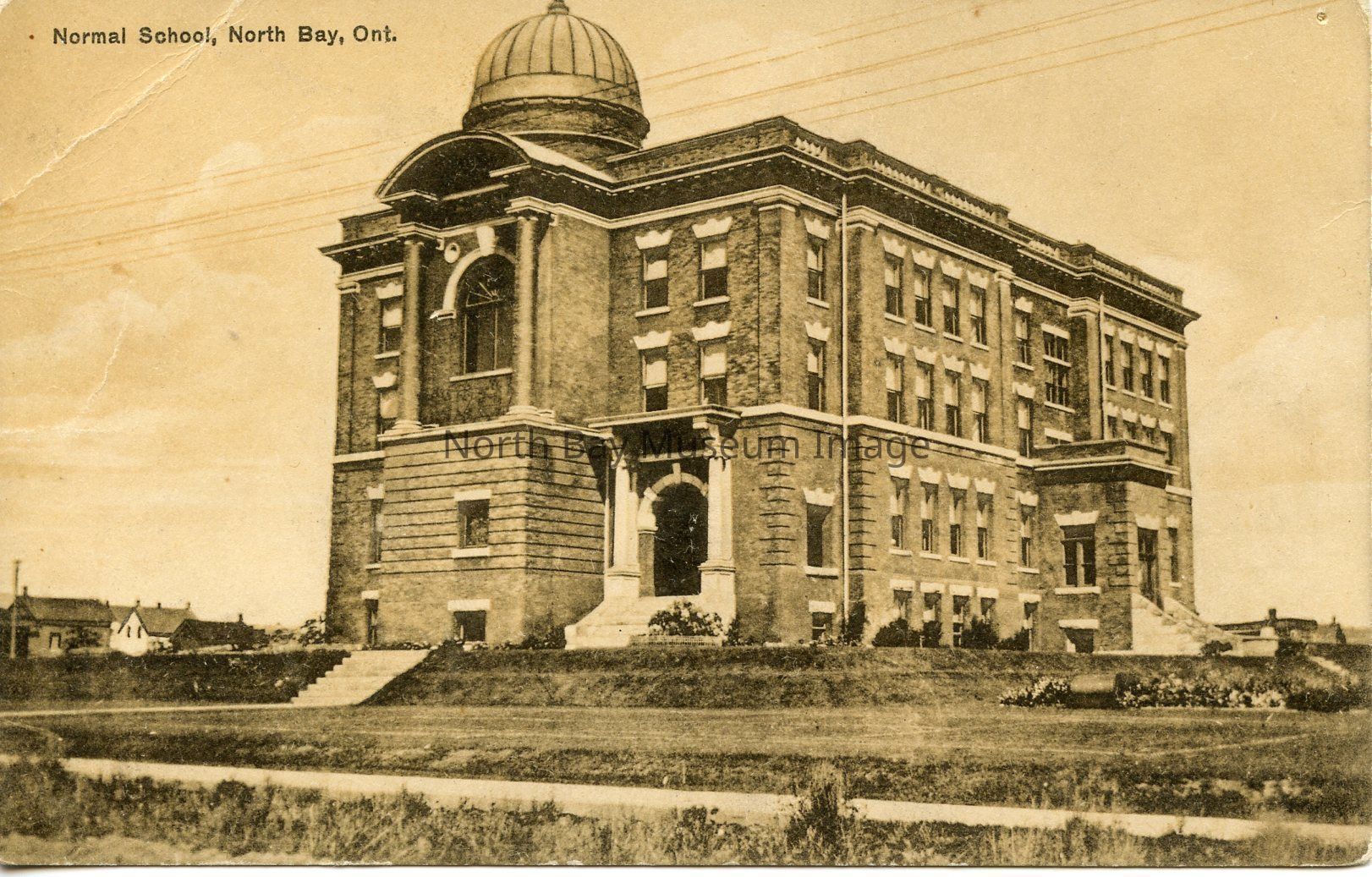 This postcard is a picture of North Bay Normal School. The Normal school is a four story brick building that has been built on a raised-tiered