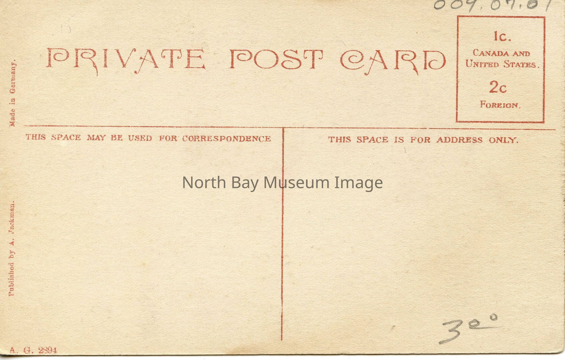 The front of the postcard is a vertical, Black and White (sepia) picture of NORMAL SCHOOL NORTH BAY. The image is taken back from the street looking straight on at the front of the Normal School. The school was built on a small hill. Note the grand windows, the grand entrance and steps to the front door, and the dome roof over the right half of the building. There appears to be snow on the ground in front of the school. "North Bay Normal School," is written on the top left hand corner in red text.
