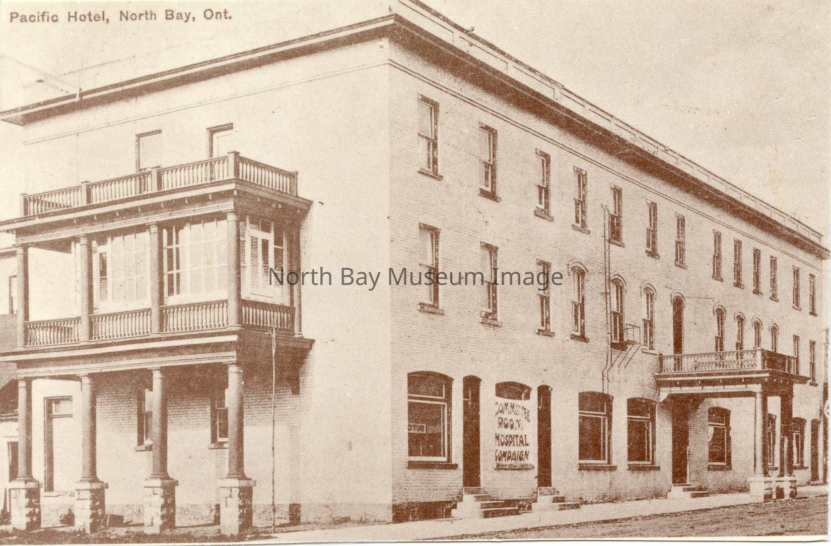 This is a sepia North Bay: 1882-1982 POSTCARD. This is an image looking at the Pacific Hotel. The hotel is a three storey, white, concrete building. There is large windows surrounding the building. At the left side of the hotel, the second and third floor has a small balcony on it. On the front of the building there is black text written on the building.Creator