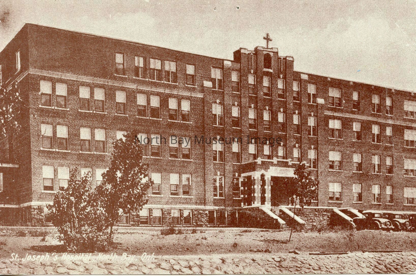 This is a North Bay:1882-1982 Postcard. the front of the postcard is a black and white photo of St. Joseph's Hospital. The hospital was located on McLaren St.. The hosptial was opened in Oct.7,1931. The Photo is circa 1934. The building is five storeys high. You can see a cross in the center of the hospital at the top of the building. The image also shows the front lawn and trees that were present in front of the building.