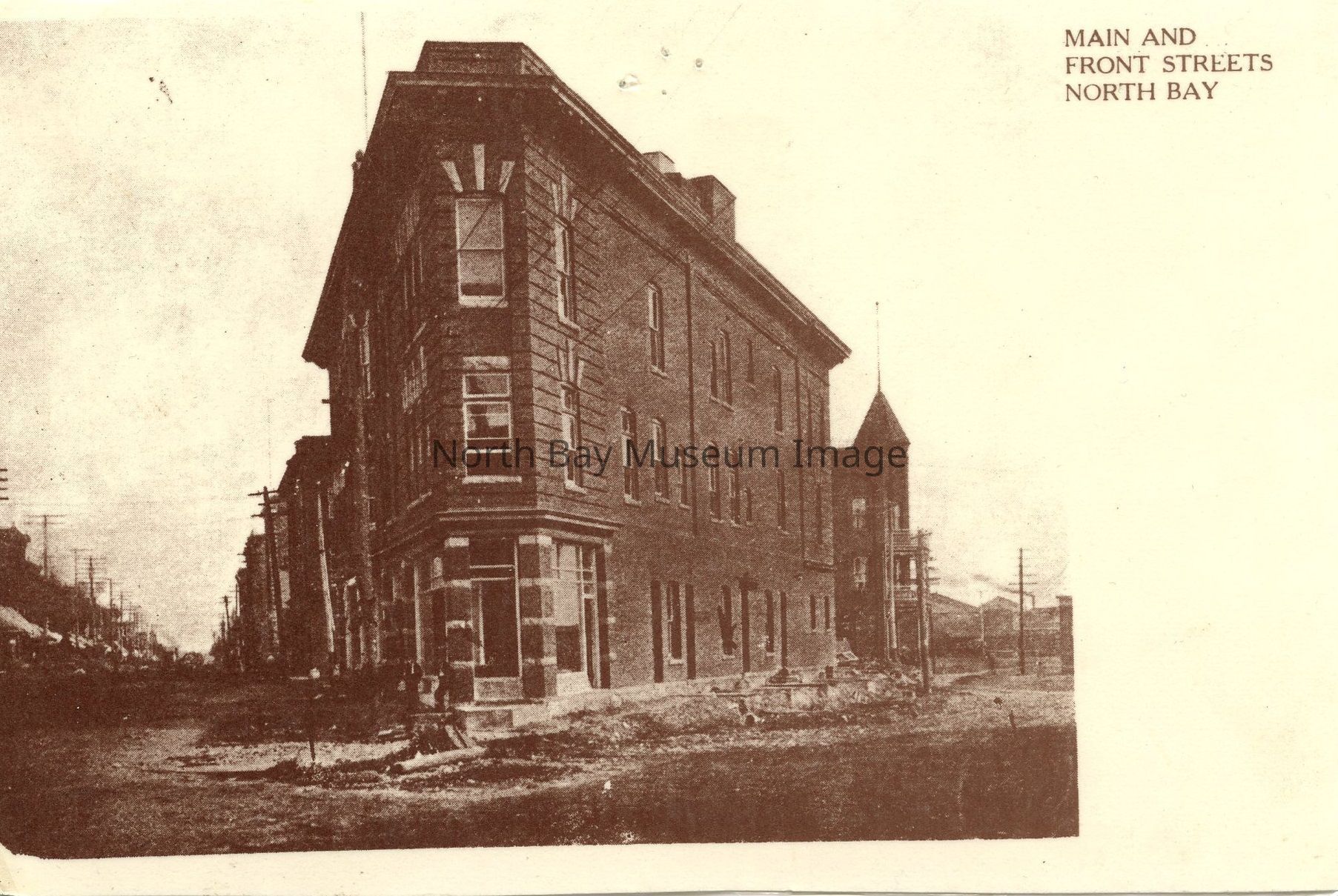 The Ferguson Block, a flatiron building at the corner of Main & Oak & Algonquin was destroyed by fire in 1964. Also known as the "Transportation Building", it was named after John McIntyre Ferguson, one of North Bay's founders and mayor (1919-1922). Oak Street wa originally named Front Street. Photo circa 1907.