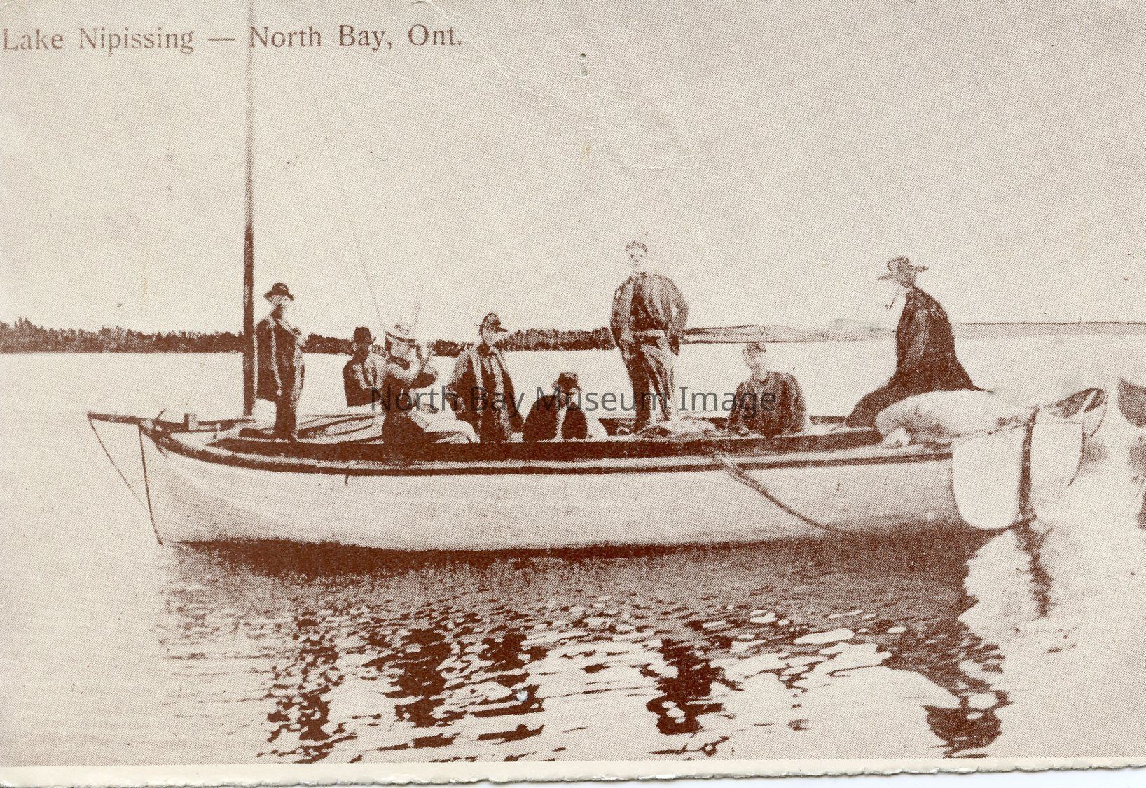 This is a black and white image of a North Bay: 1882-1982 Postcard. The image is taken in Lake Nipissing. The image is of a group of men, and a woman standing and sitting in a fishing boat. The propeller appears to be lifted out of the water in this image. This Photo is Circa 1907.Creator