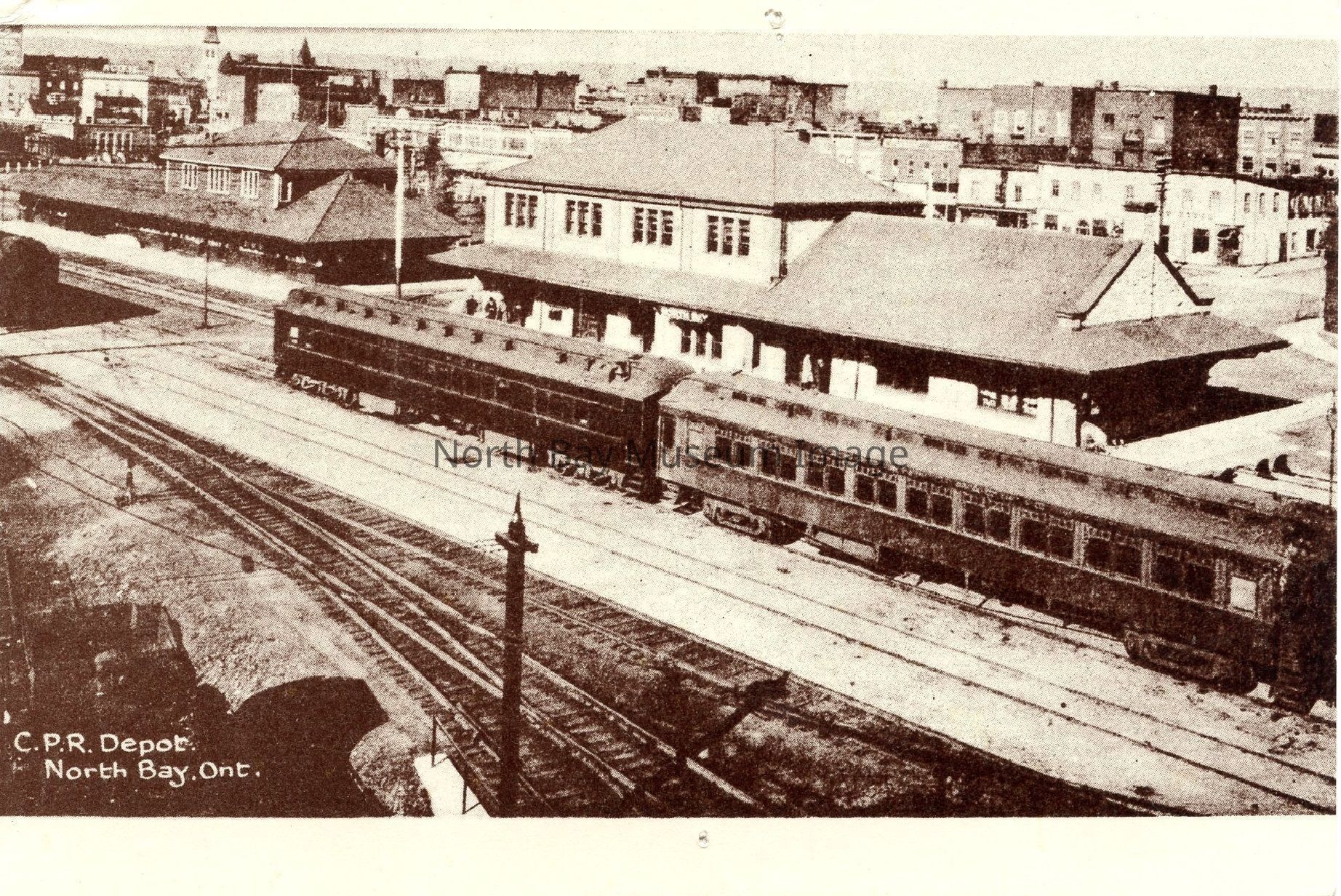 North Bay: 1882-1982 Postcard C.P.R. depot downtown in background Photo circa 1930 Postcard is number 36 of 42 in series distributed by Wm.R. Forder Souvenirs, North Bay, Ont.