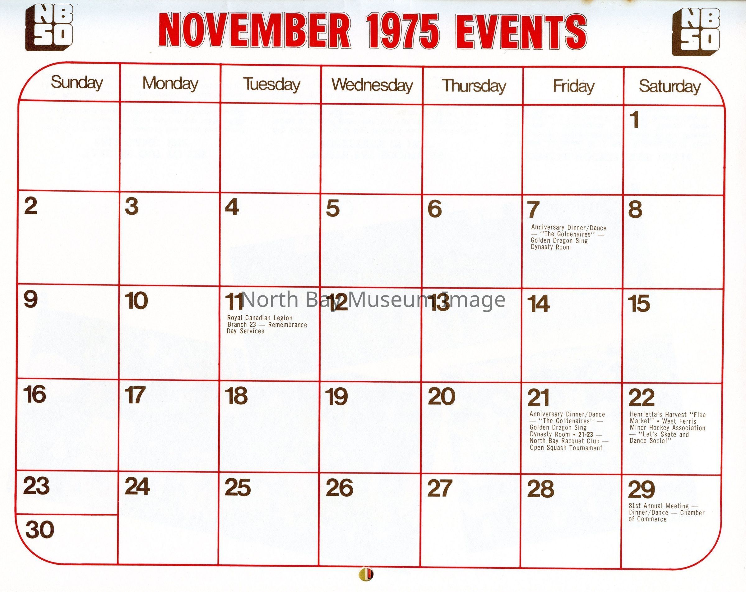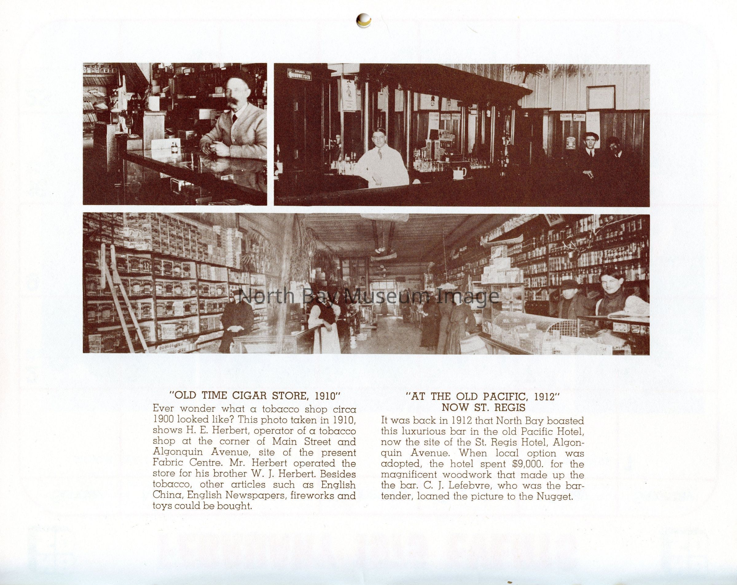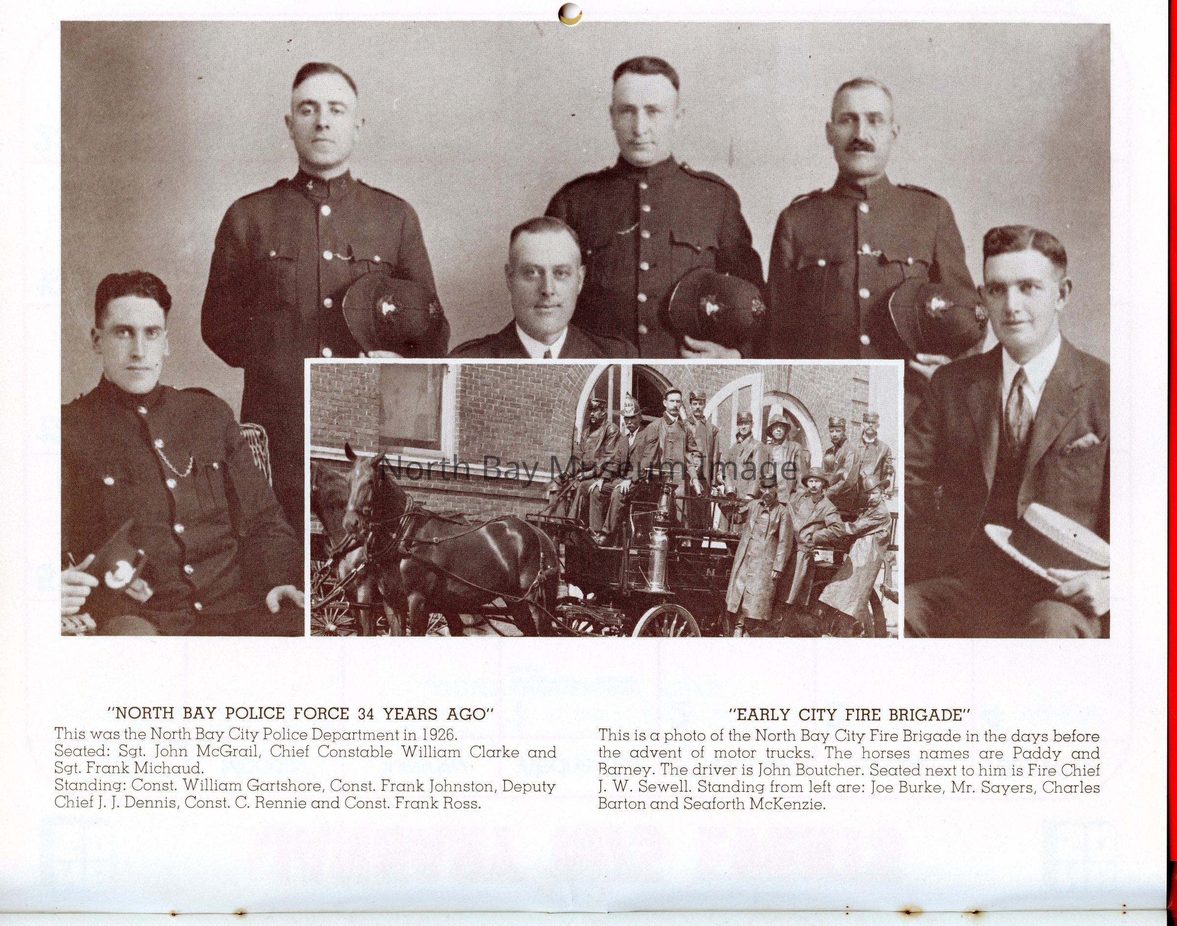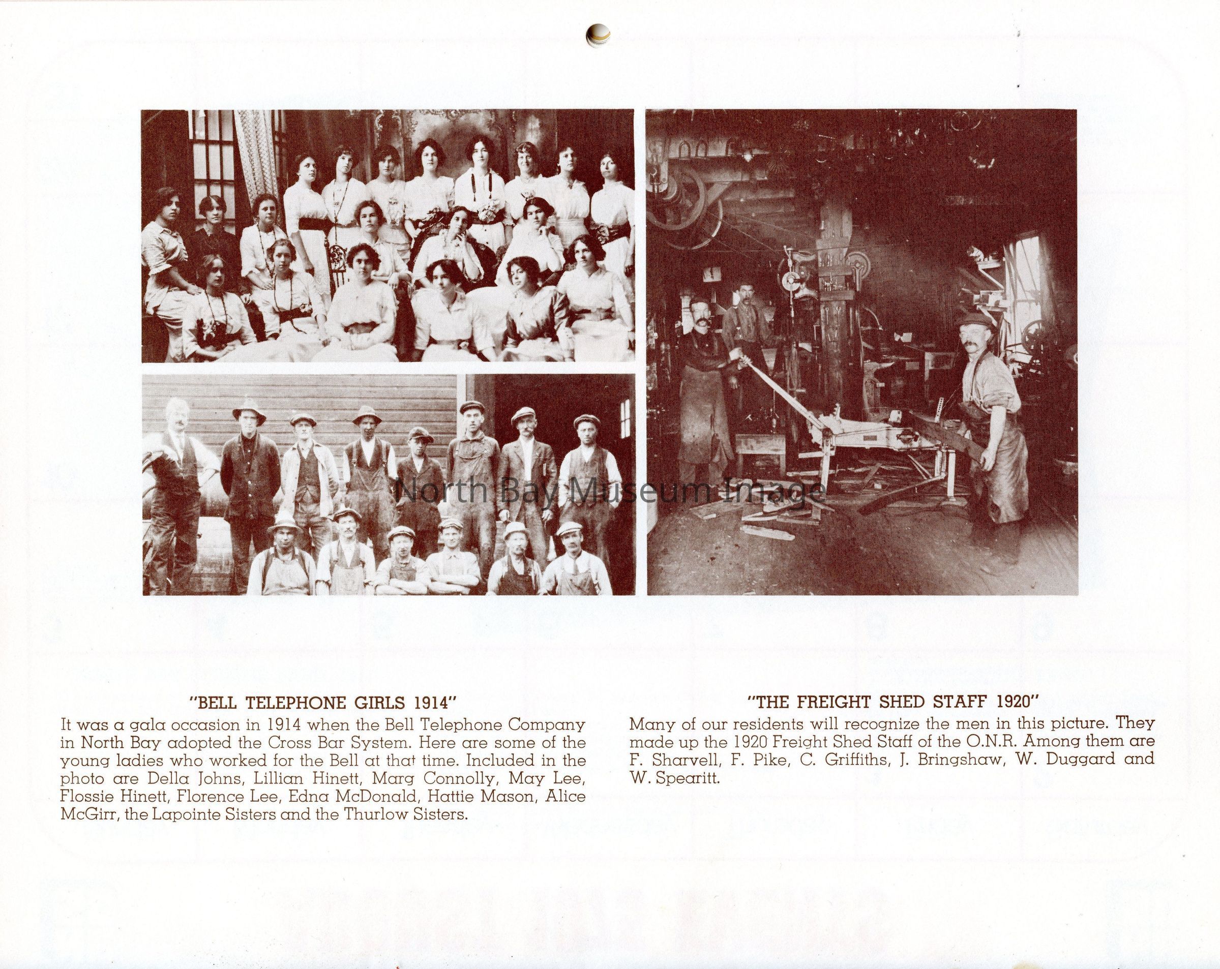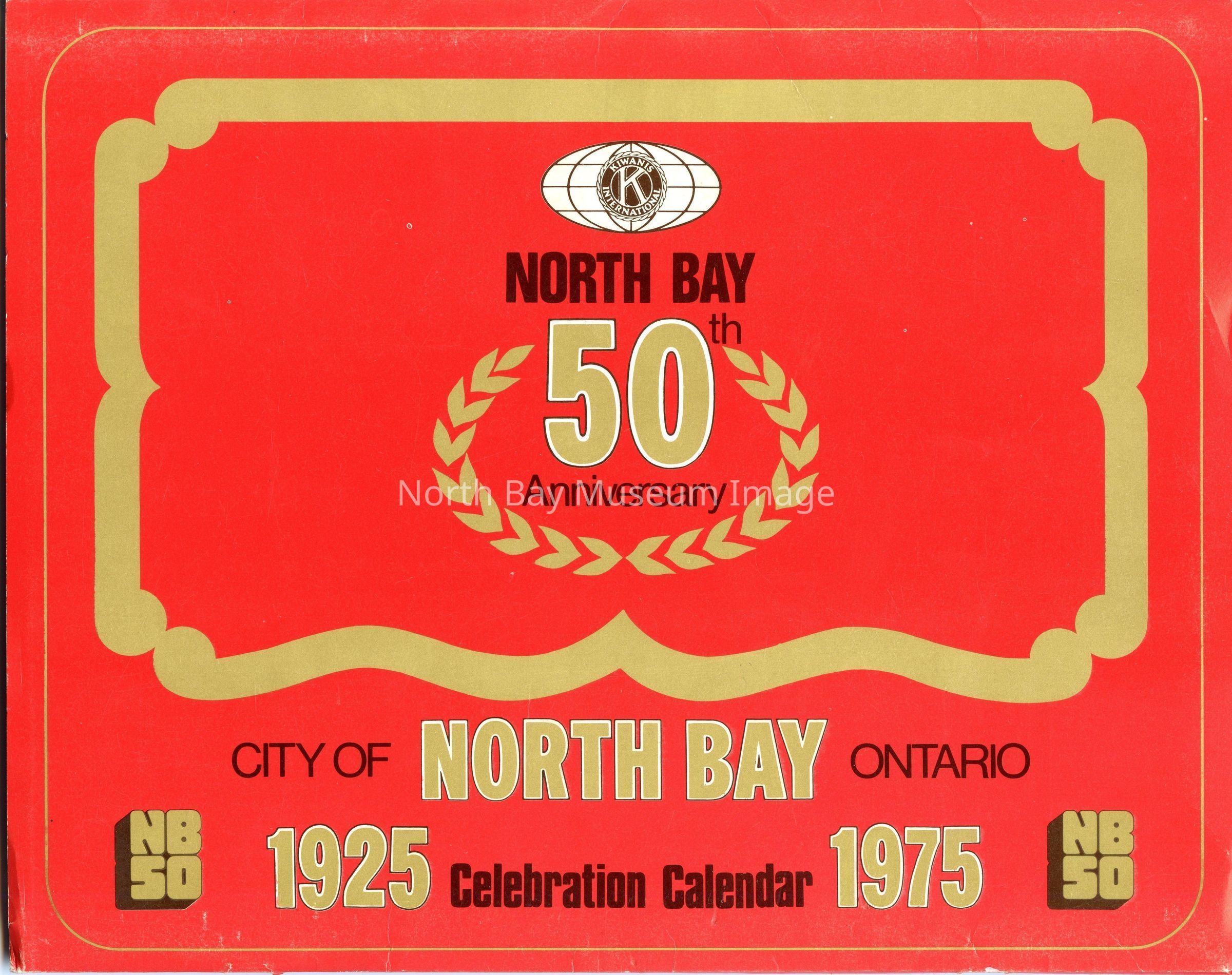 Calendar containing various photographs detailing the history of North Bay, cover is red with gold and black machine print and design. Includes photos and information about various businesses including street scenes, St. Regis Hotel interior, North Bay Police, Old Time Cigar Store, ball games, hunters and more.Creator