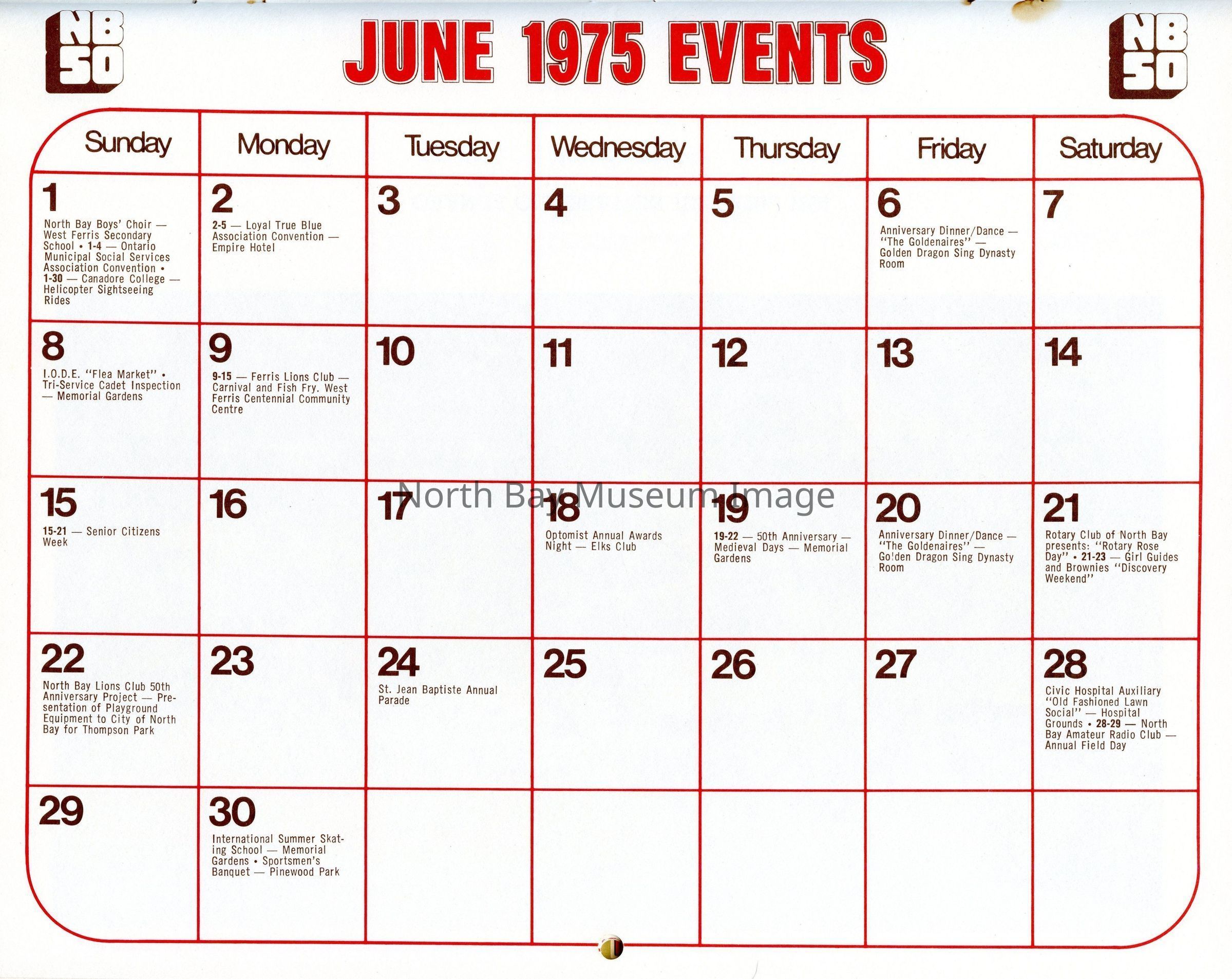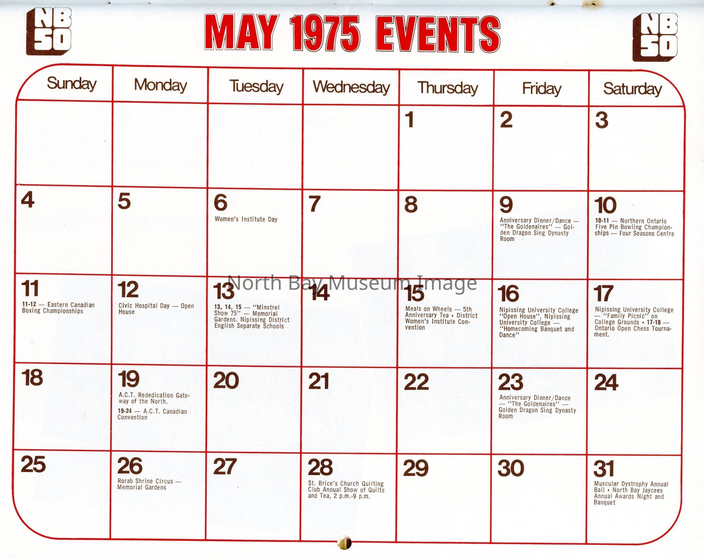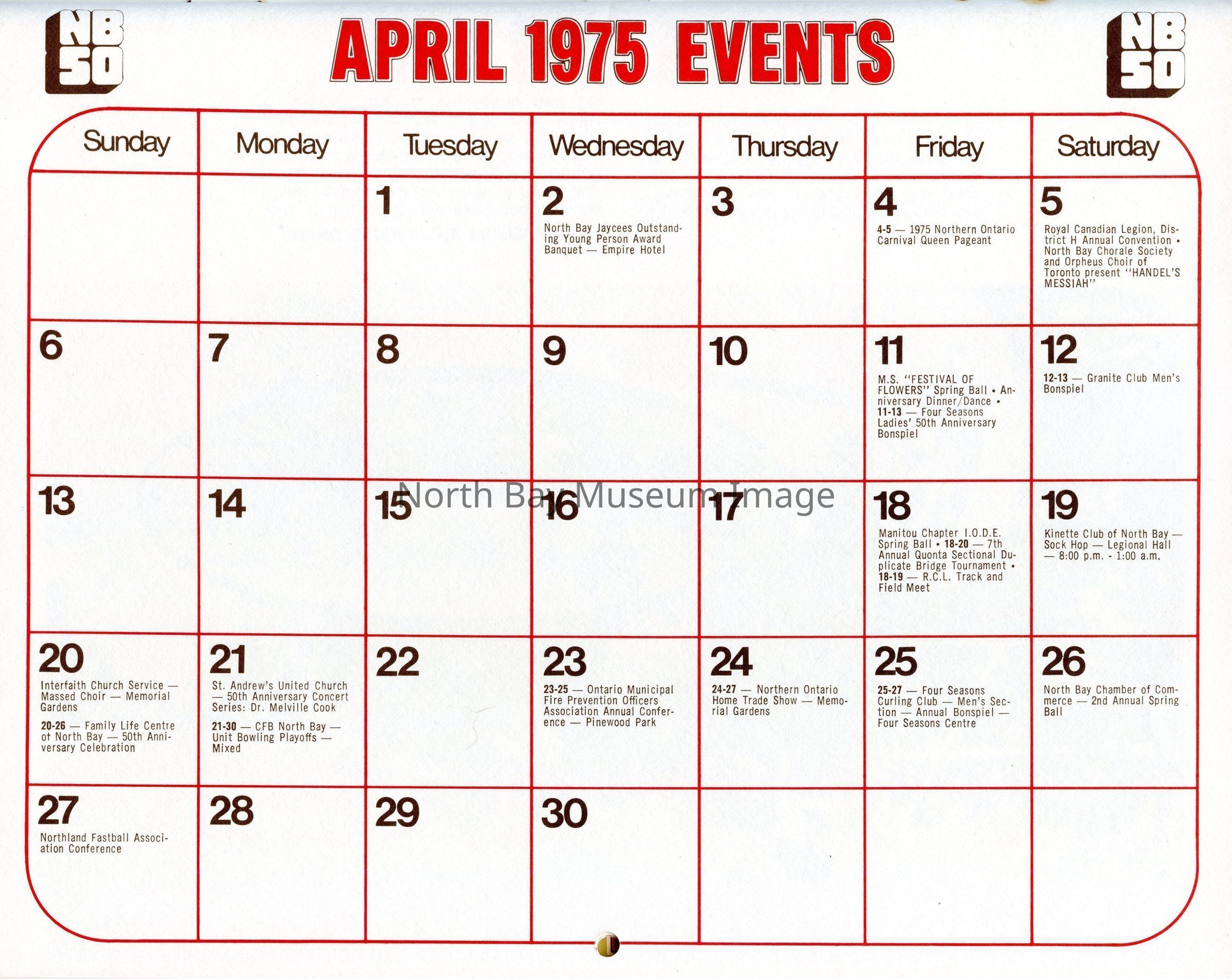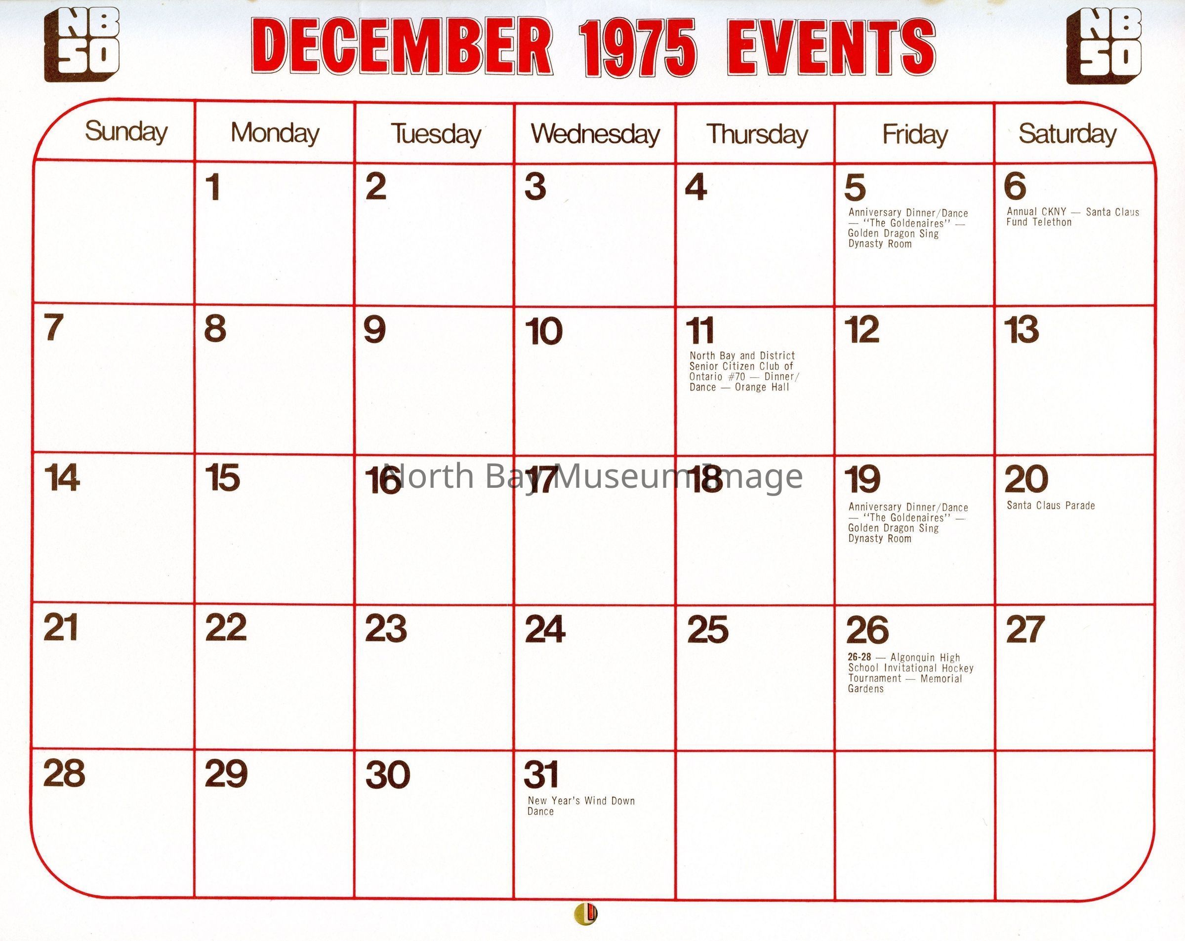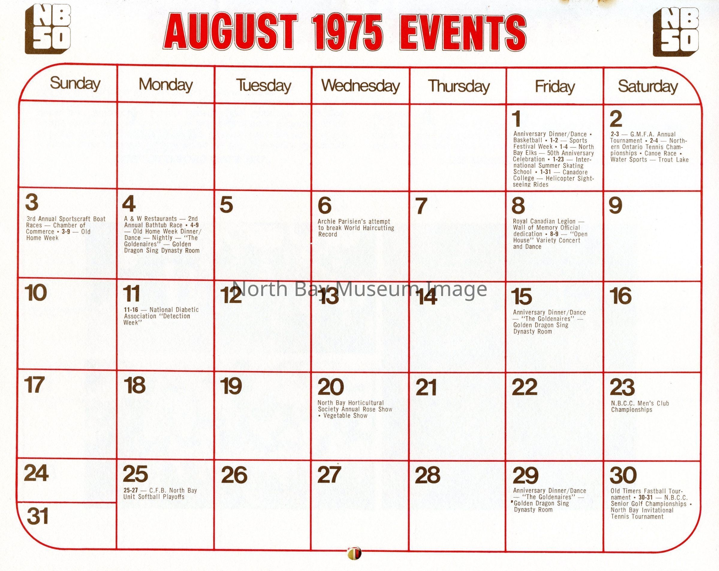 Calendar containing various photographs detailing the history of North Bay, cover is red with gold and black machine print and design. Includes photos and information about various businesses including street scenes, St. Regis Hotel interior, North Bay Police, Old Time Cigar Store, ball games, hunters and more.Creator