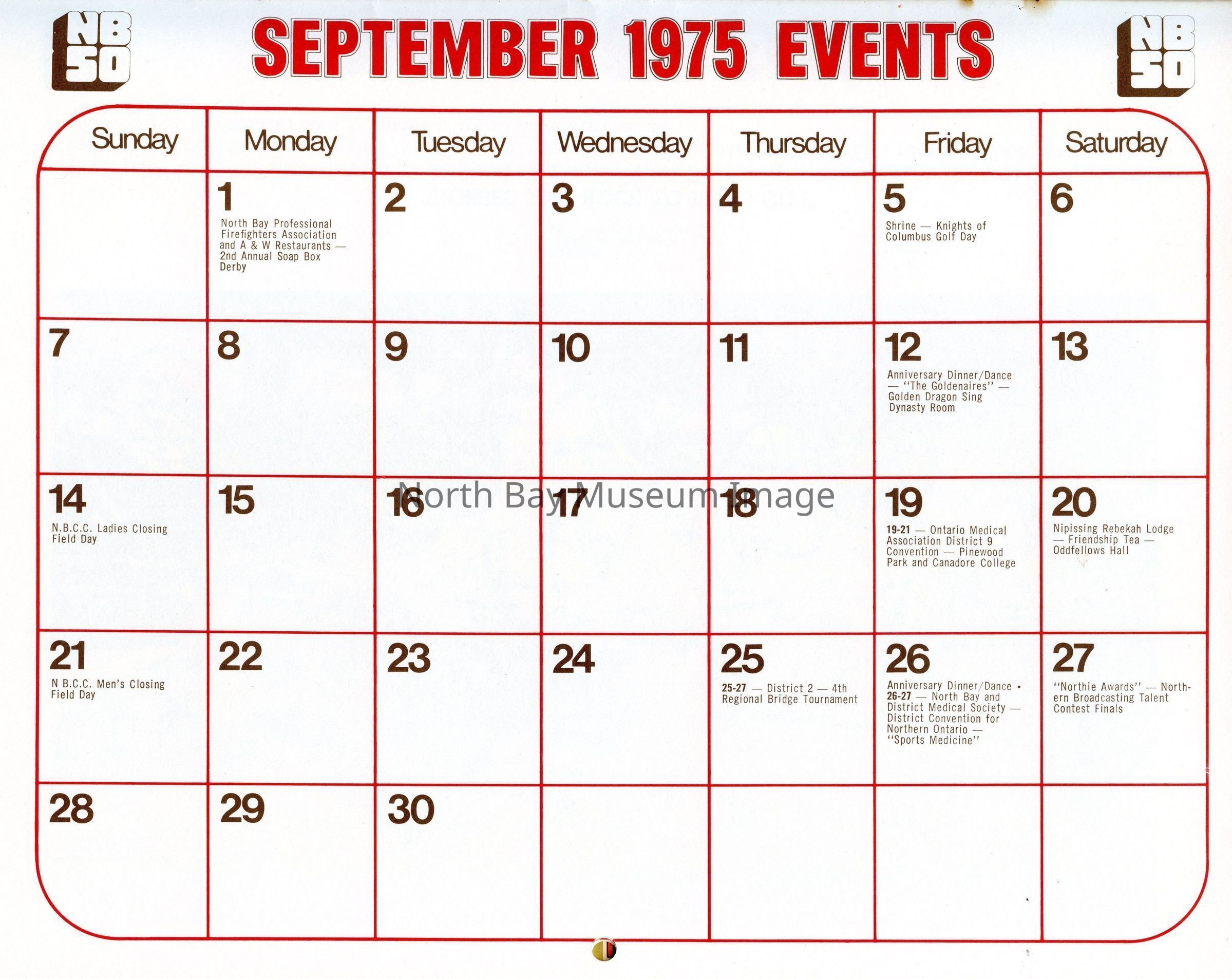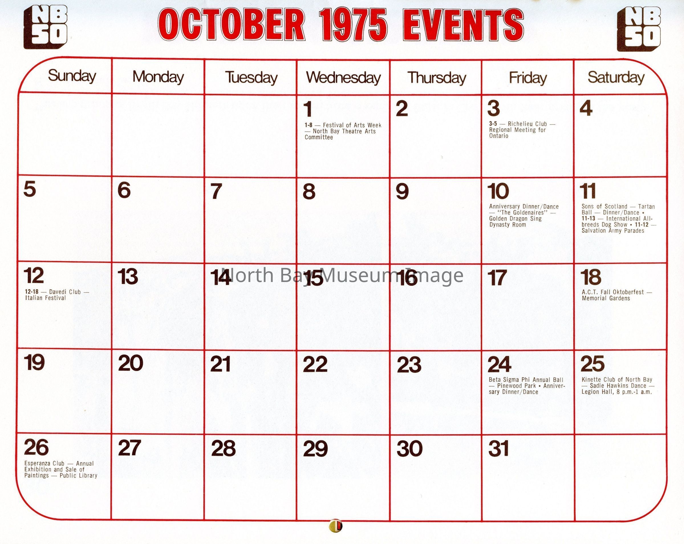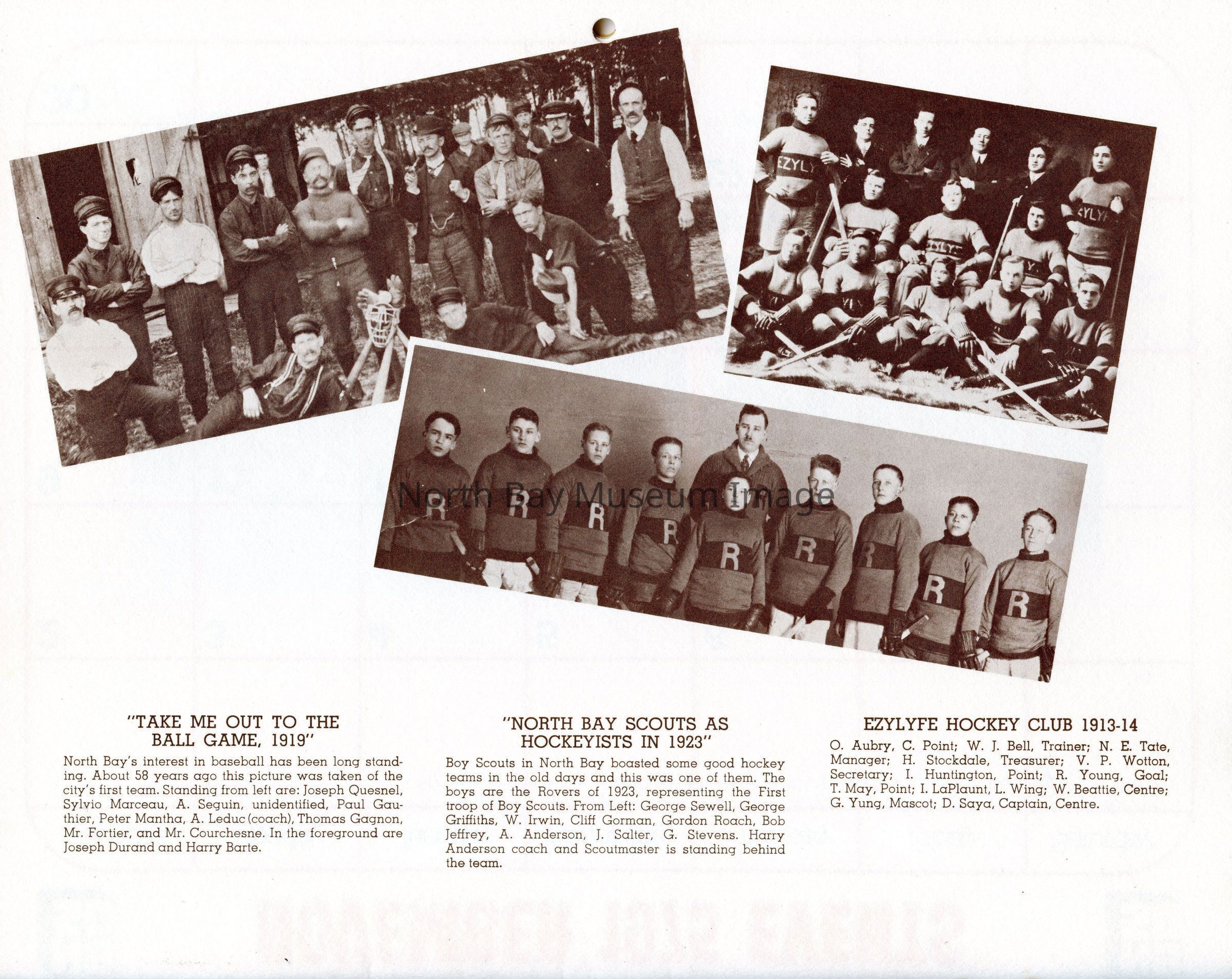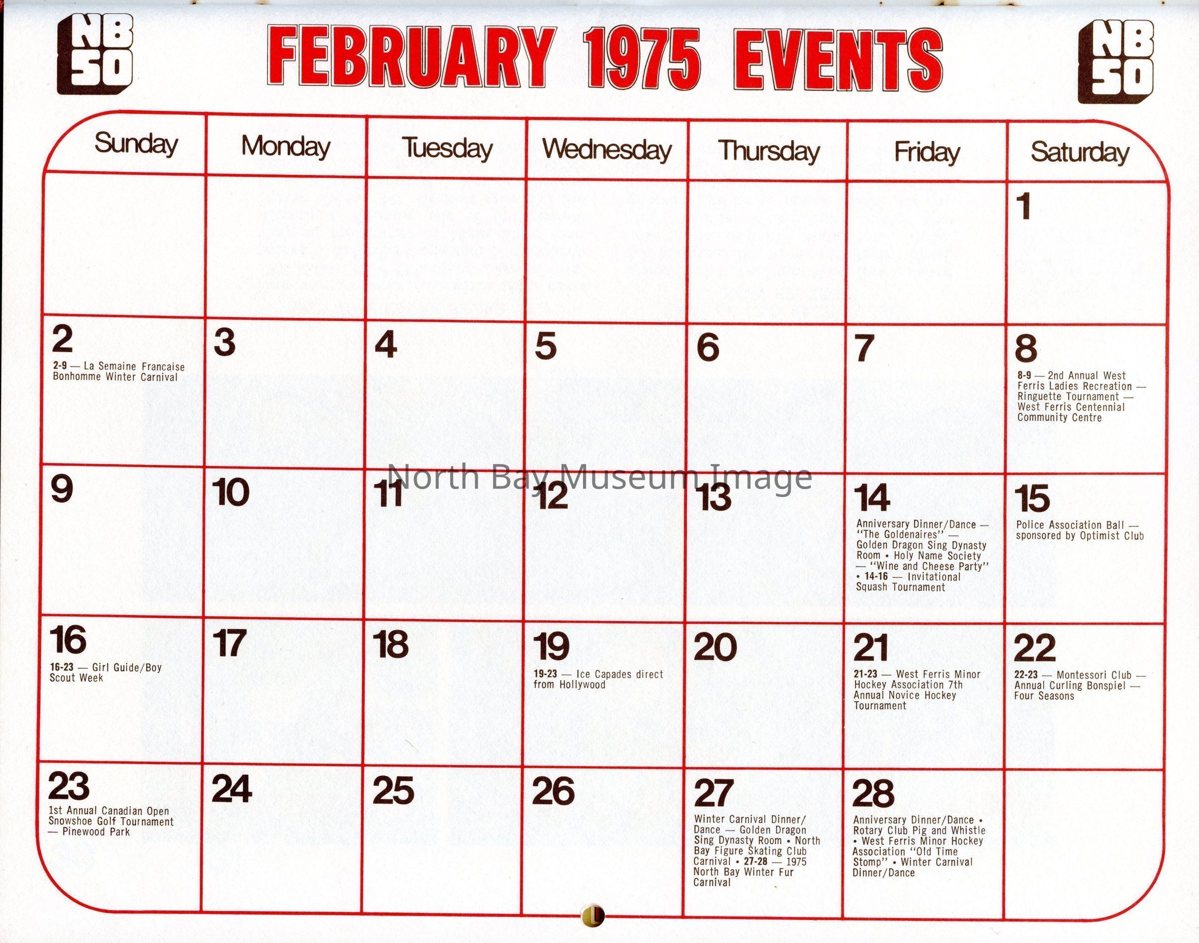 Calendar containing various photographs detailing the history of North Bay, cover is red with gold and black machine print and design. Includes photos and information about various businesses including street scenes, St. Regis Hotel interior, North Bay Police, Old Time Cigar Store, ball games, hunters and more.Creator