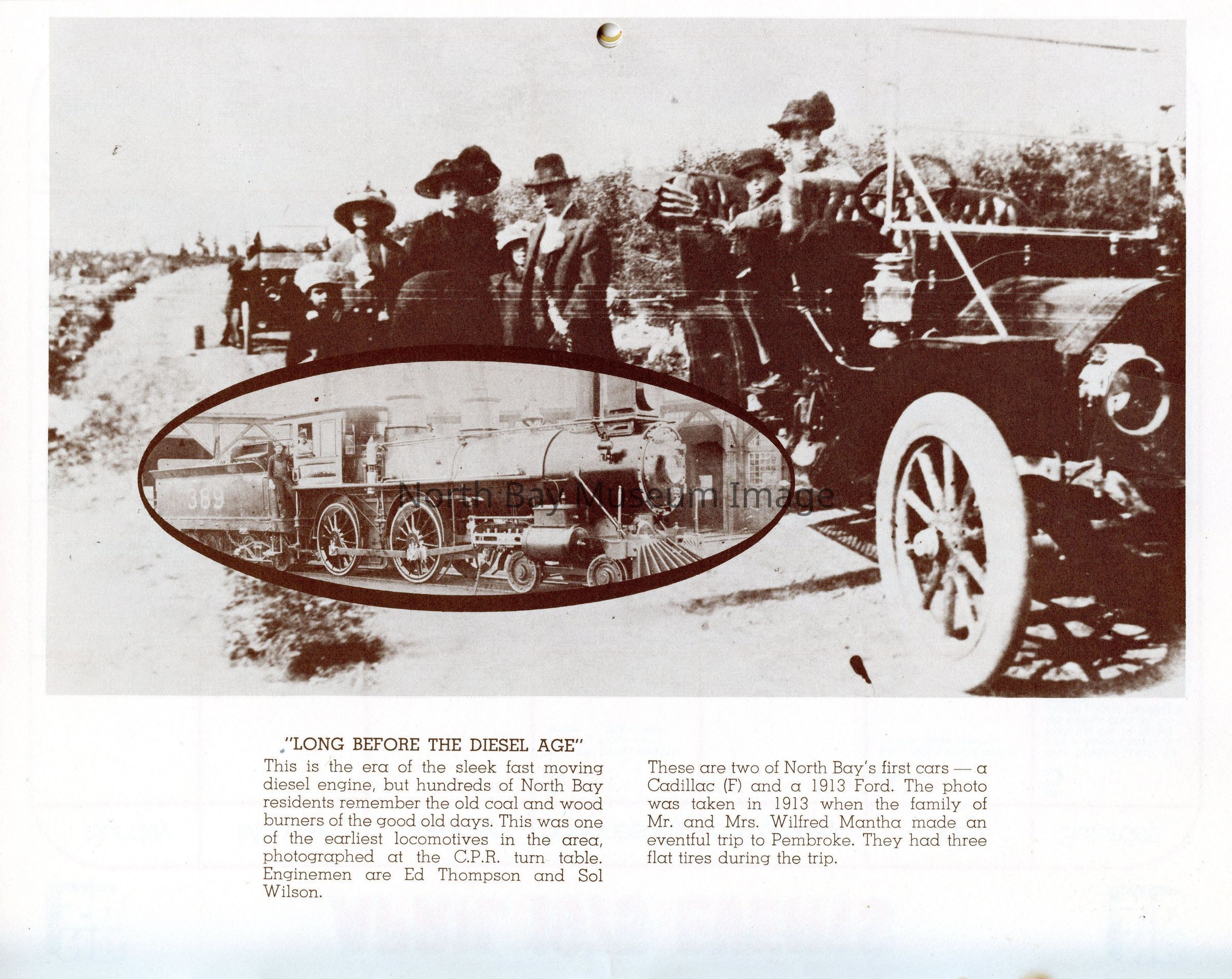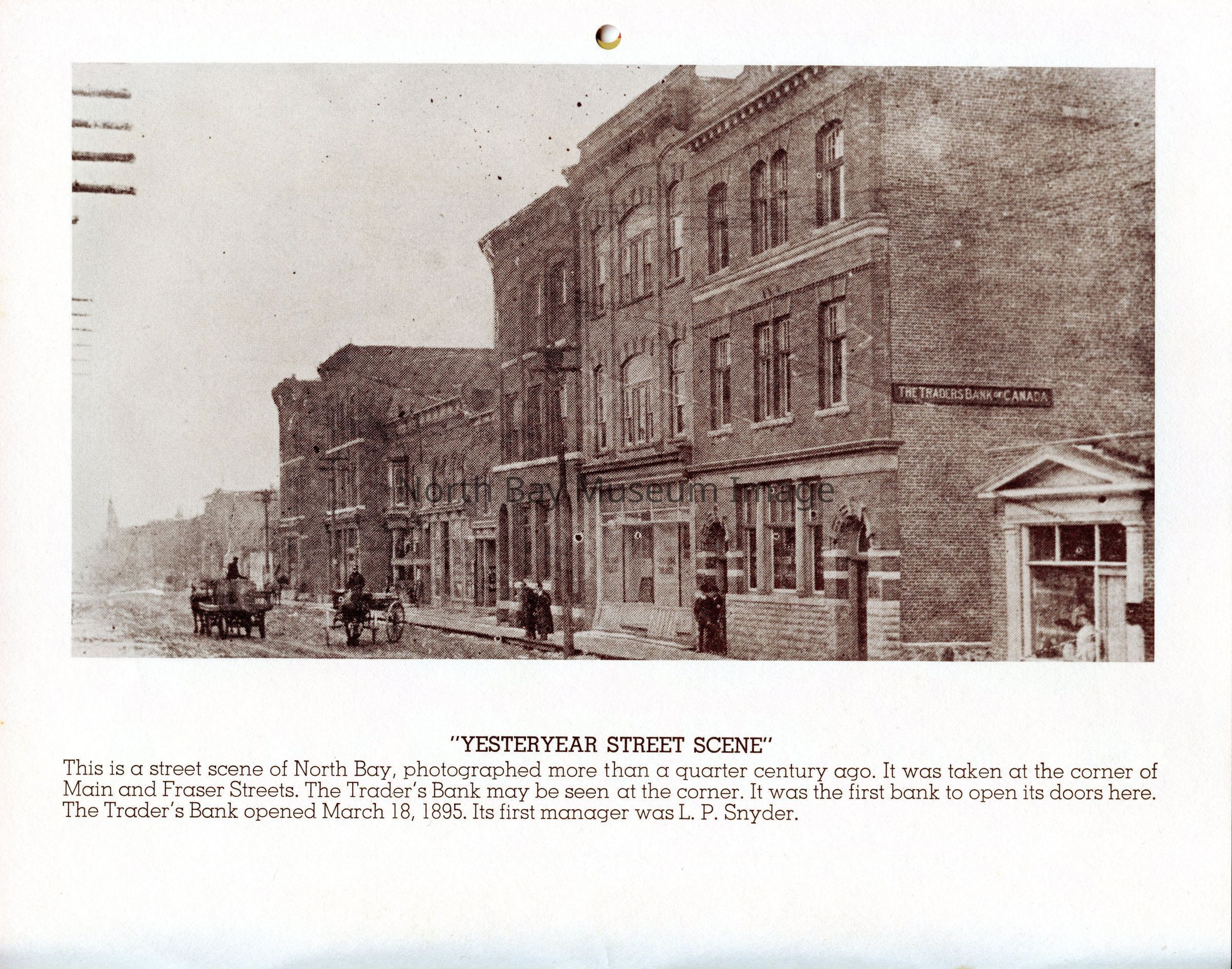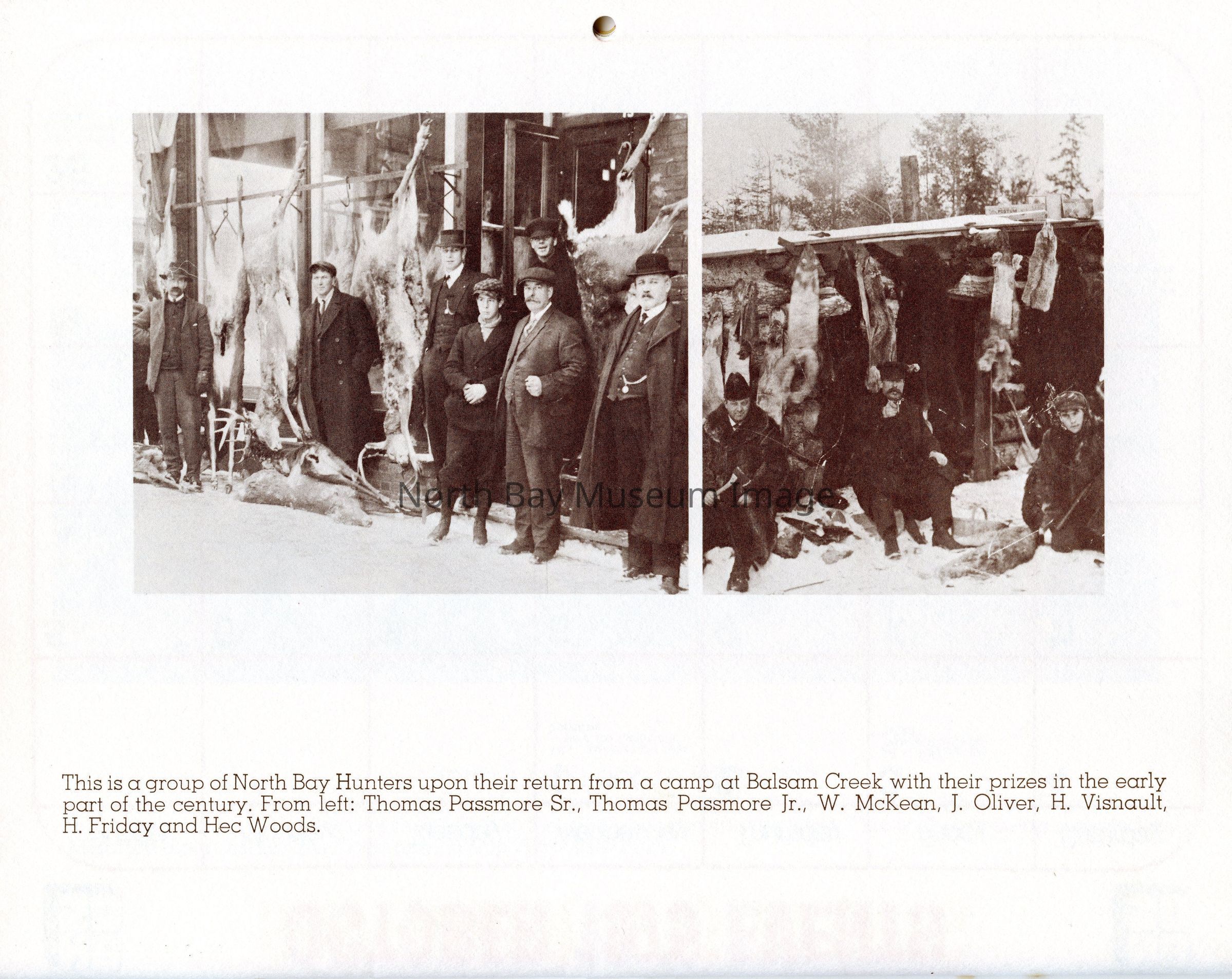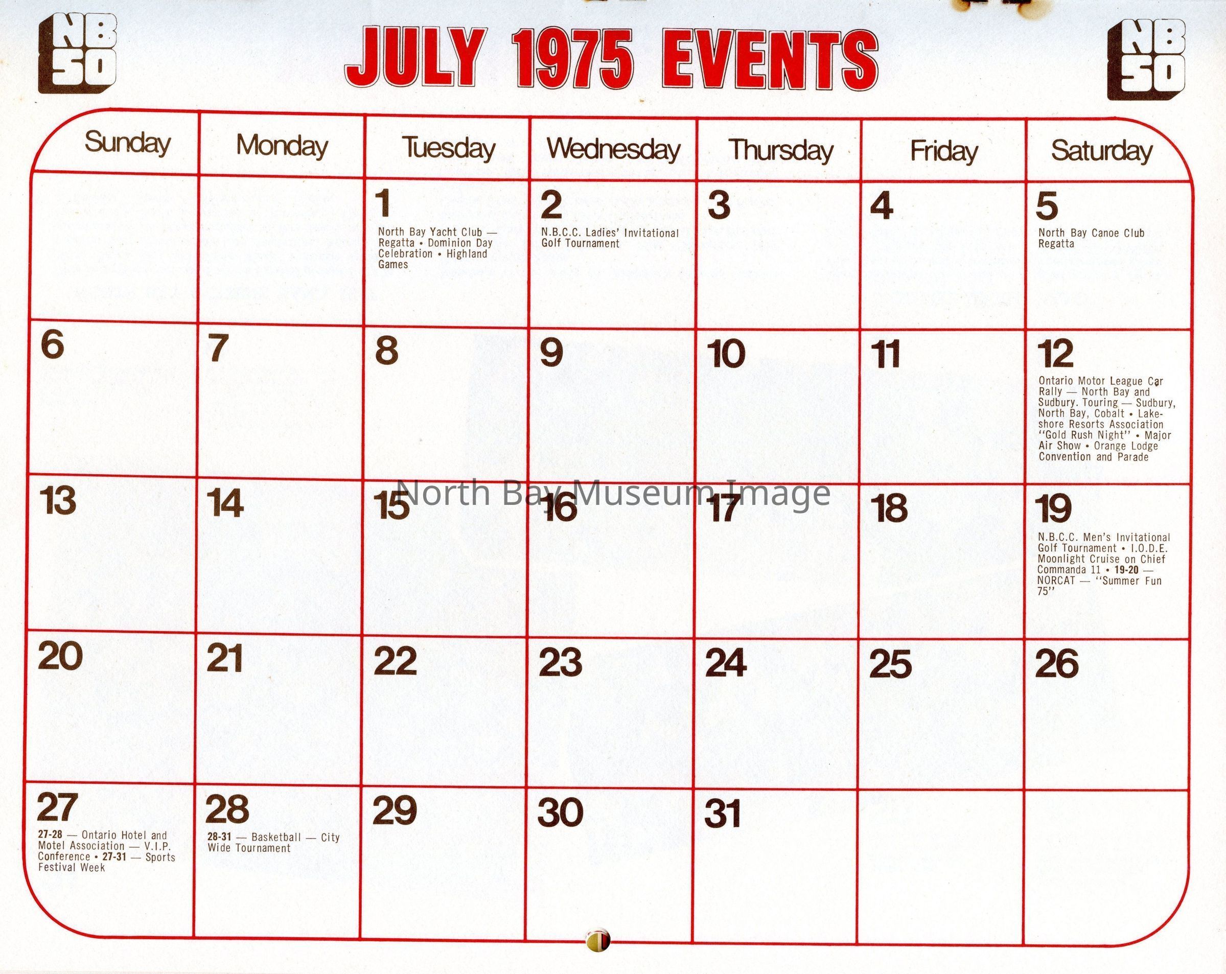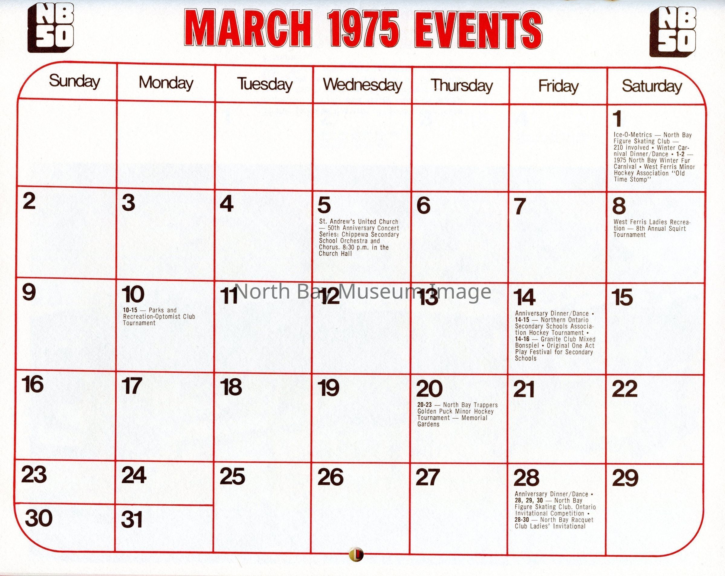 Calendar containing various photographs detailing the history of North Bay, cover is red with gold and black machine print and design. Includes photos and information about various businesses including street scenes, St. Regis Hotel interior, North Bay Police, Old Time Cigar Store, ball games, hunters and more.Creator