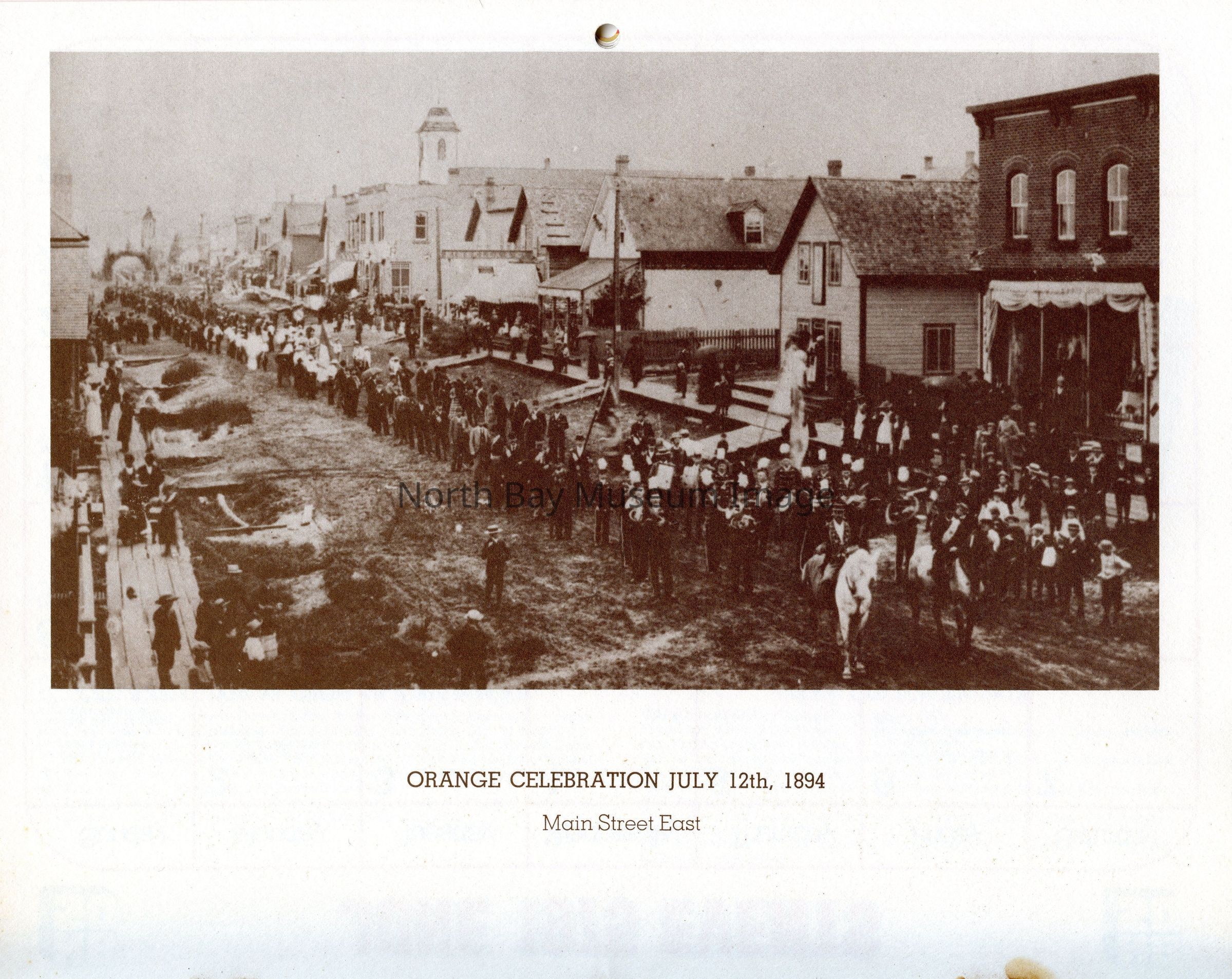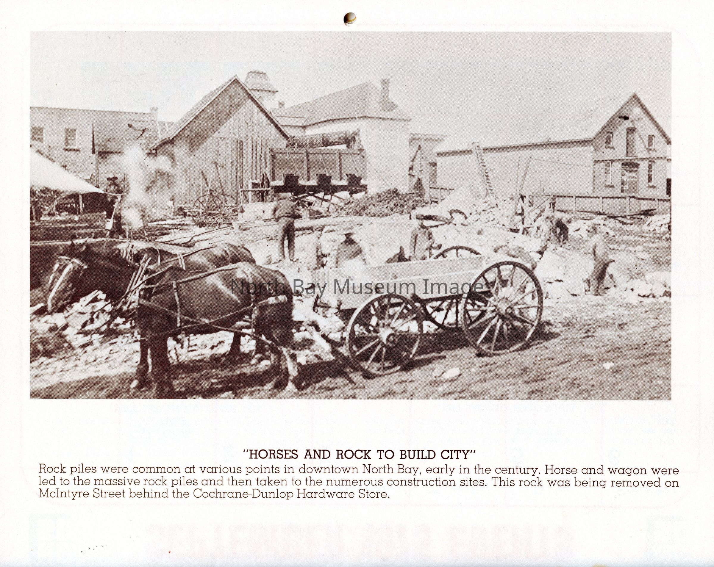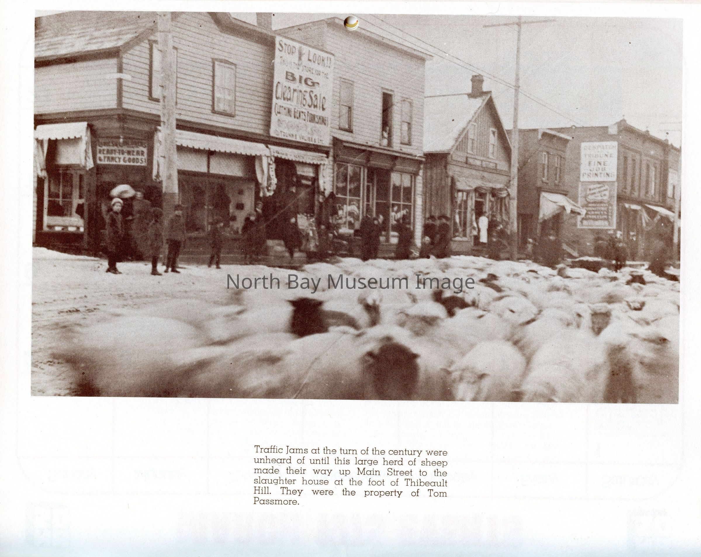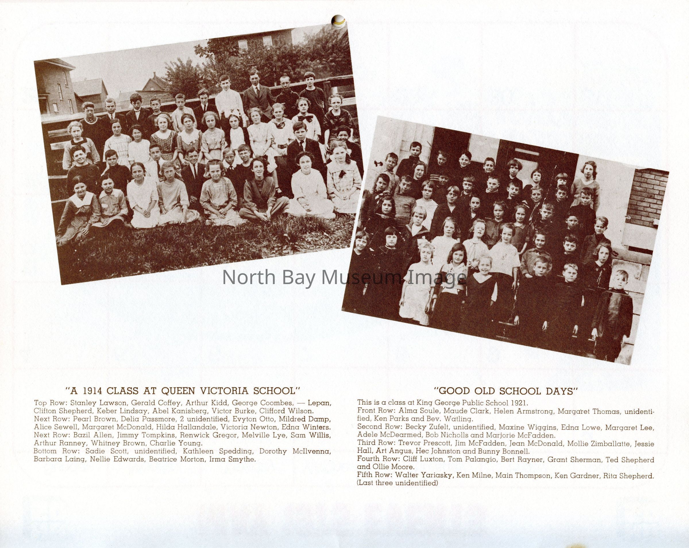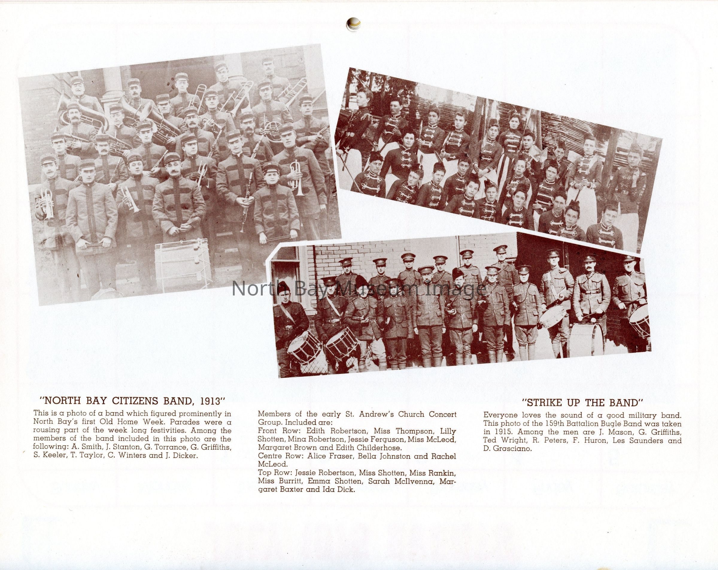 Calendar containing various photographs detailing the history of North Bay, cover is red with gold and black machine print and design. Includes photos and information about various businesses including street scenes, St. Regis Hotel interior, North Bay Police, Old Time Cigar Store, ball games, hunters and more.Creator