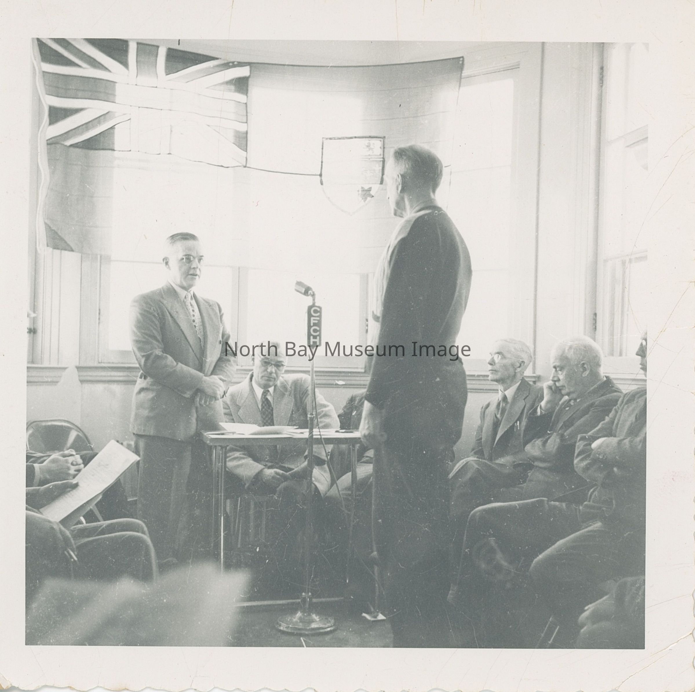 Airport office photo with Lorne Hicks and other airport employees. Back of photo reads "Lorne (sitting) in his airport office with some of his men. Sam Foley talking to men." Part of the Hicks Collection.
