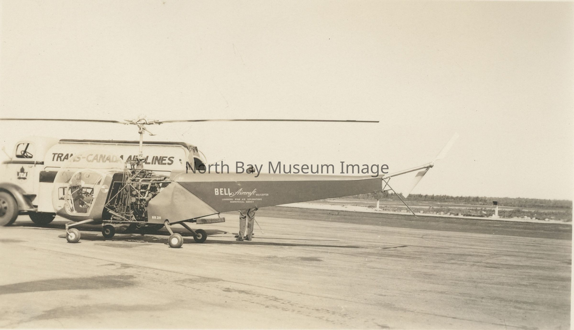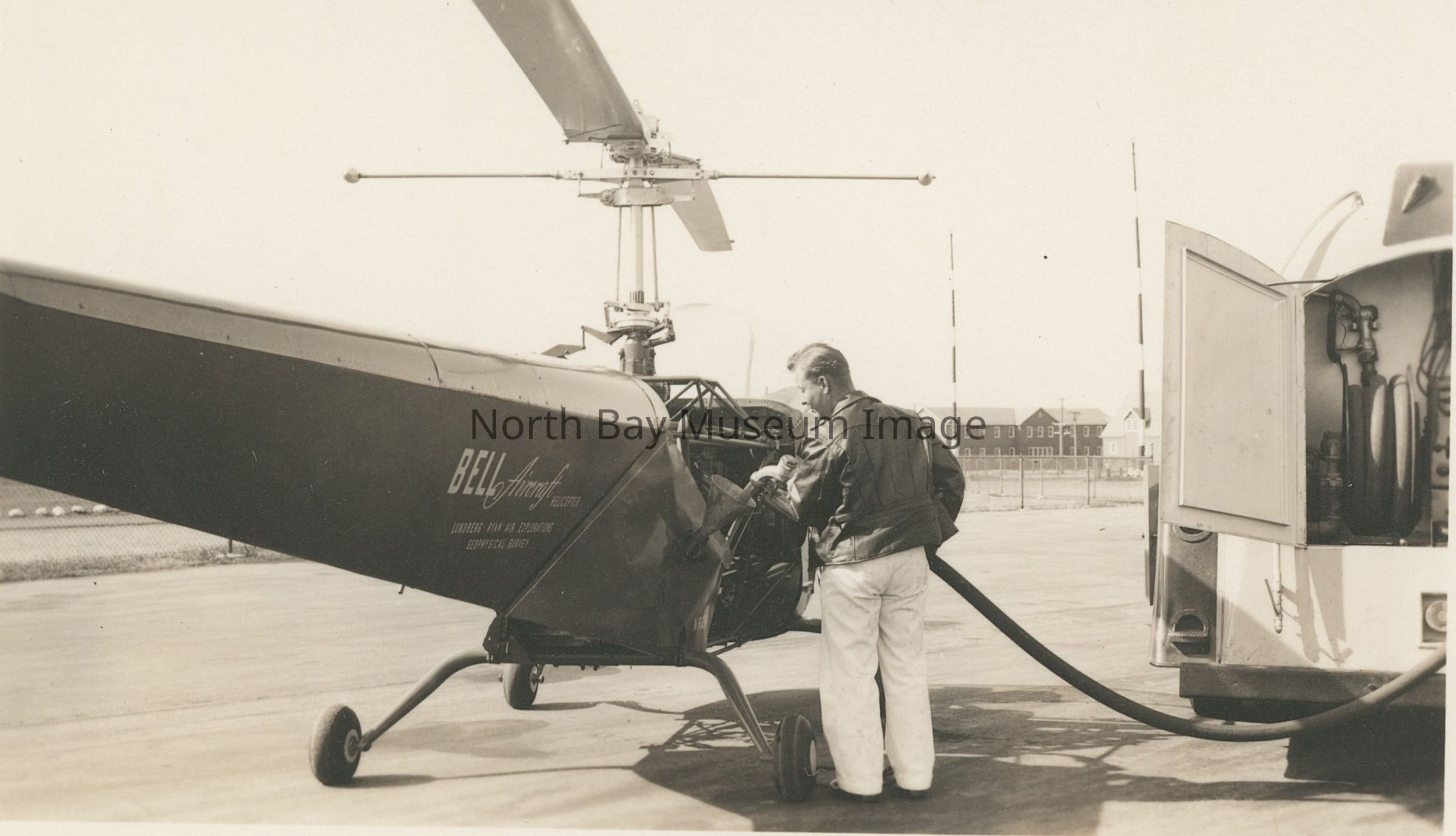 Hans Lundberg, a geophysicist with the Lundberg-Ryan Air Exploration Company in Toronto, Ont., had leased a Bell 47 pre-production prototype (flown by Bell experimental test pilot Gerald (Jay) Demming) direct from Bell Aircraft in June 1946 to test out an experimental magnetometer on mineral surveys. The magnetic survey took place in northern Ontario near Sudbury, at the Frood Mine owned by the International Nickel Company (a.k.a. INCO). Reported by Bob Petote, and air attack officer with the Alberta Forest Protection Division in the July 2009 Vertical Magazine.